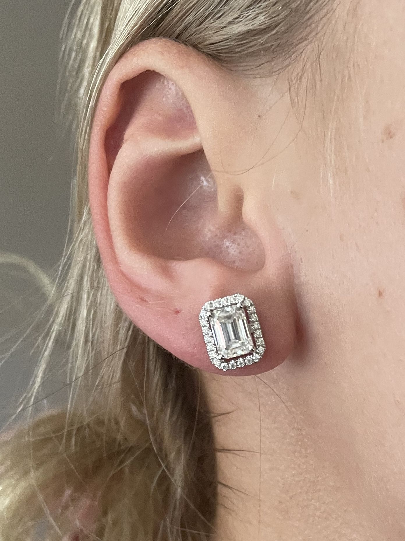 2 CTW emerald cut moissanite earrings, each ear has a 1 carat (5x7mm) emerald cut moissanite surrounded by a moissanite halo in 10k white gold. MOISSANITE NOT DIAMOND
