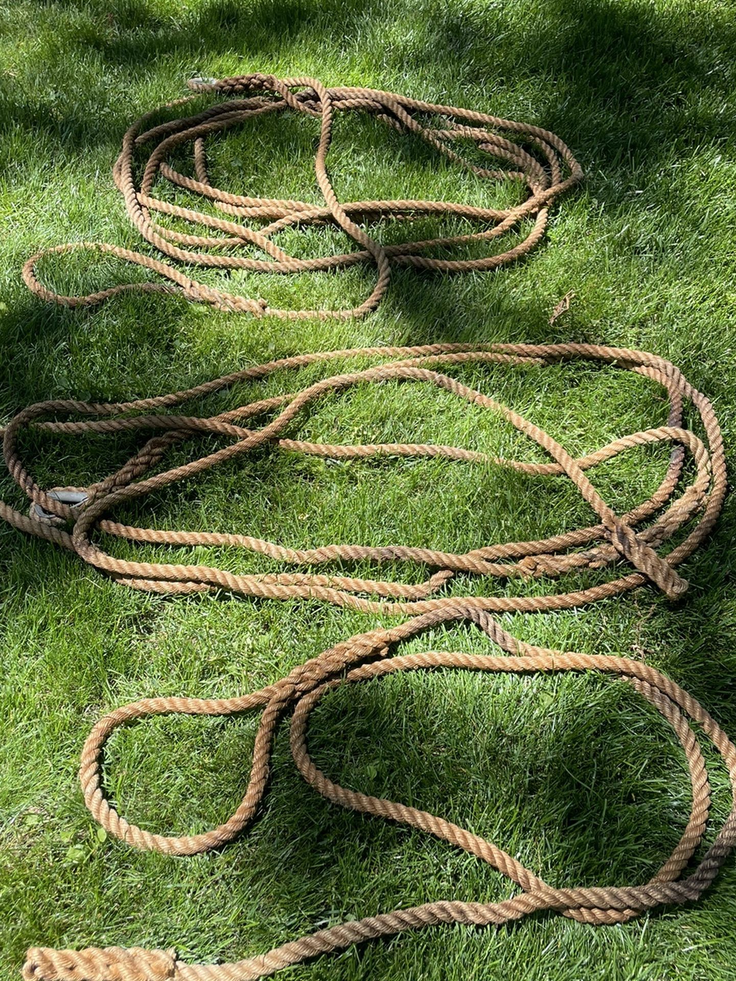 condition: excellent A while back in my travels I ran across this old three-quarter inch manila line at a yard sale. Two galvanized thimbles had been spliced in place, while the rest of the line was cut into four pieces. I decided to add five other spices into the line for decorative purposes. Those spices include 2 Eye Slices, 1 Short Splice, and 2 End Splices. The first length of line is approximately 42 feet in length. The second is approximately 22 feet in length, and the last is approximately 8 feet in length. They might look pretty cool dressing up somebody’s Nautical Room. I’m asking $75 for all or best offer. 631-two five 8 six five 07. Thanks, Tom