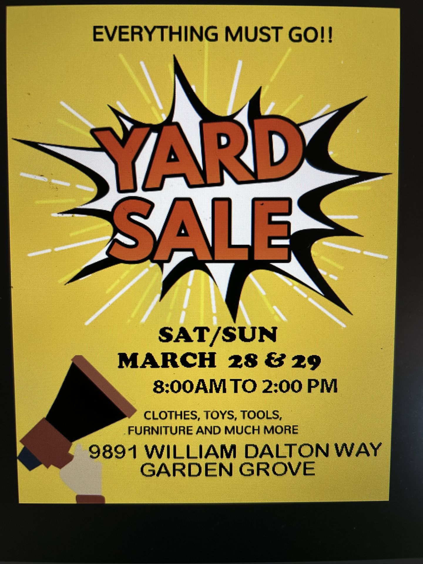 Sat n Sun 8am to 2pm Come on By so you can see... Furnitrue,clothes,tools,ladders, and so much more. 9891 William Dalton Way Garden Grove (contact info removed)