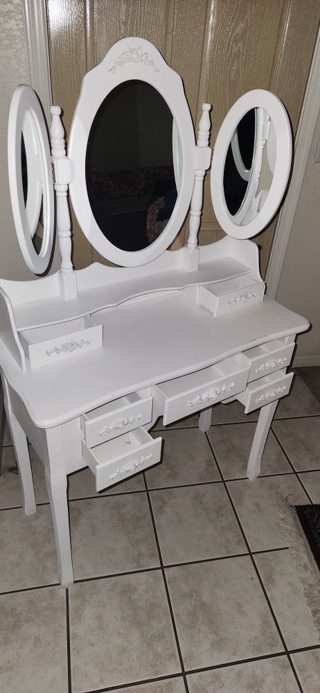 White Vanity Makeup Dressing Table With Tri-Fold Mirror And Drawers