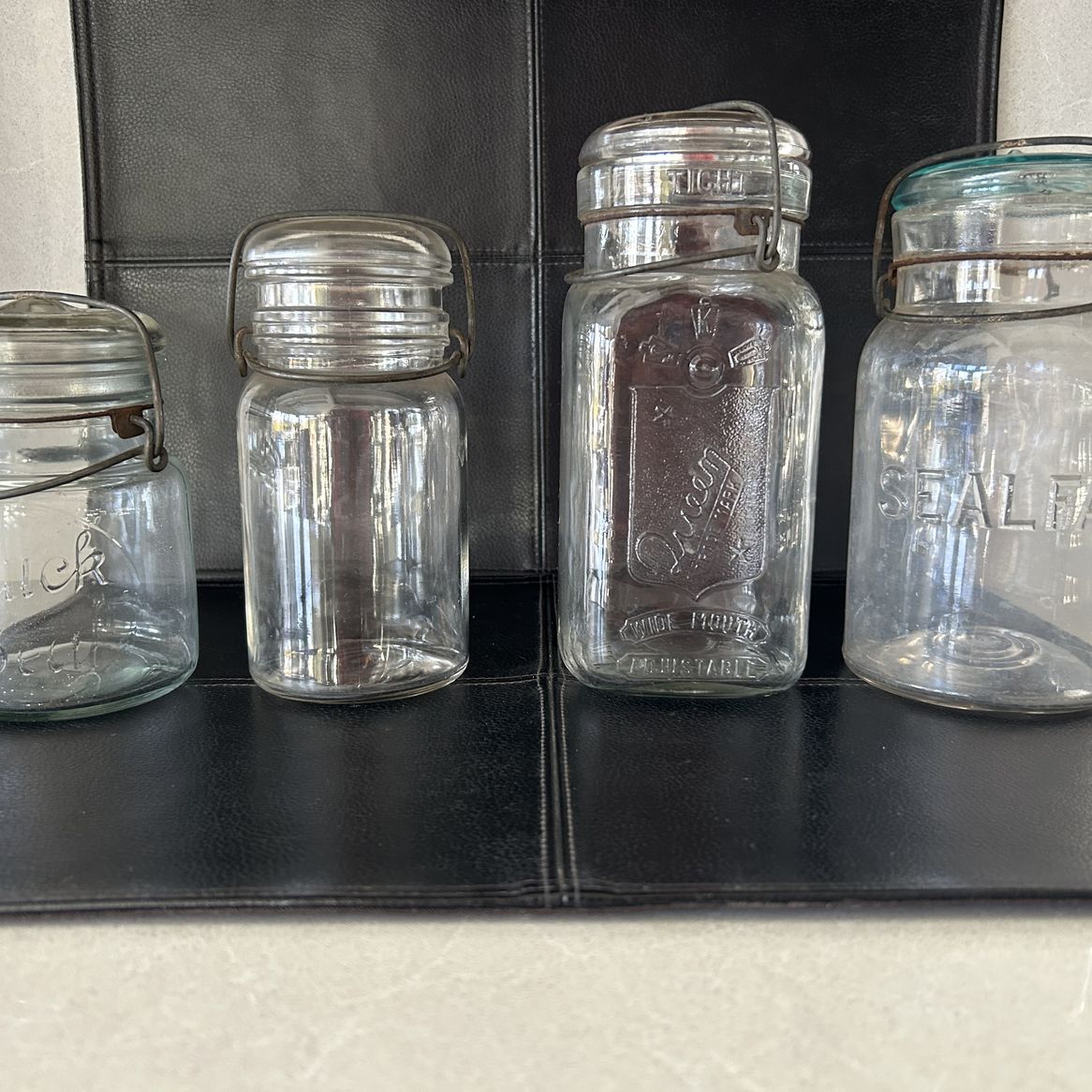 Four early 1900s canning jars with metal clasps. Quick Seal- 5”, has 0 embossed in the glass on the bottom. Ball?- 6”, has B embossed in the glass on the bottom Queen Wide Mouth- 8”. Made by Smalley, Kivlan, and Onthank of Boston Foster Sealfast - 7” Pick up in Mundelein.