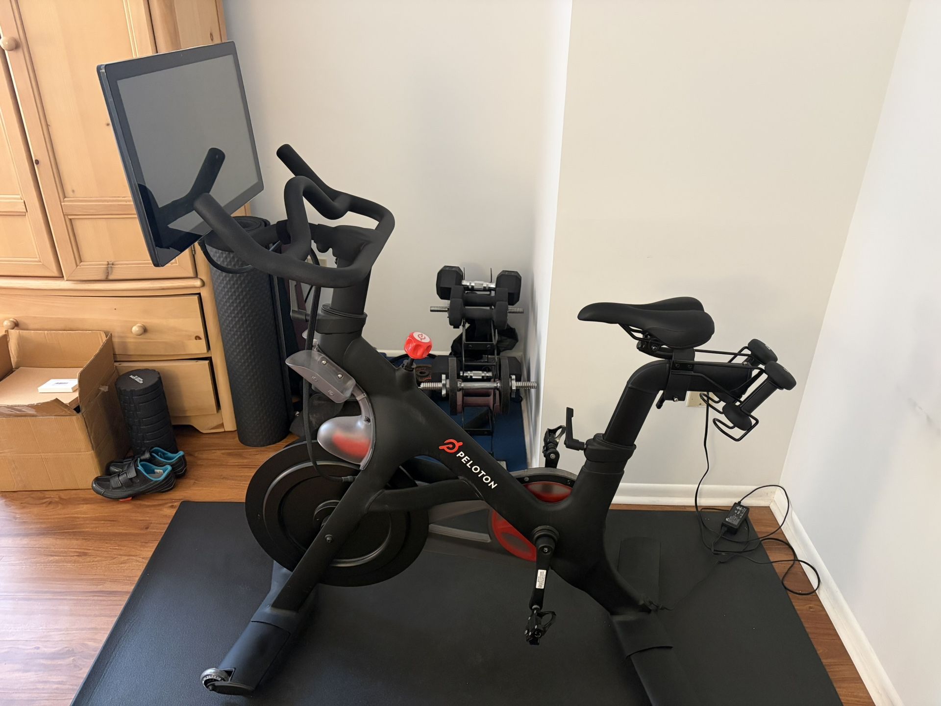 Peloton bike purchased in 2020 in good working condition. Screen, resistance and pedals function properly. Peloton bike mat and original 3 lb hand weights are included. Adult owned in non smoking home. Located in West Orange, NJ for pick up only.