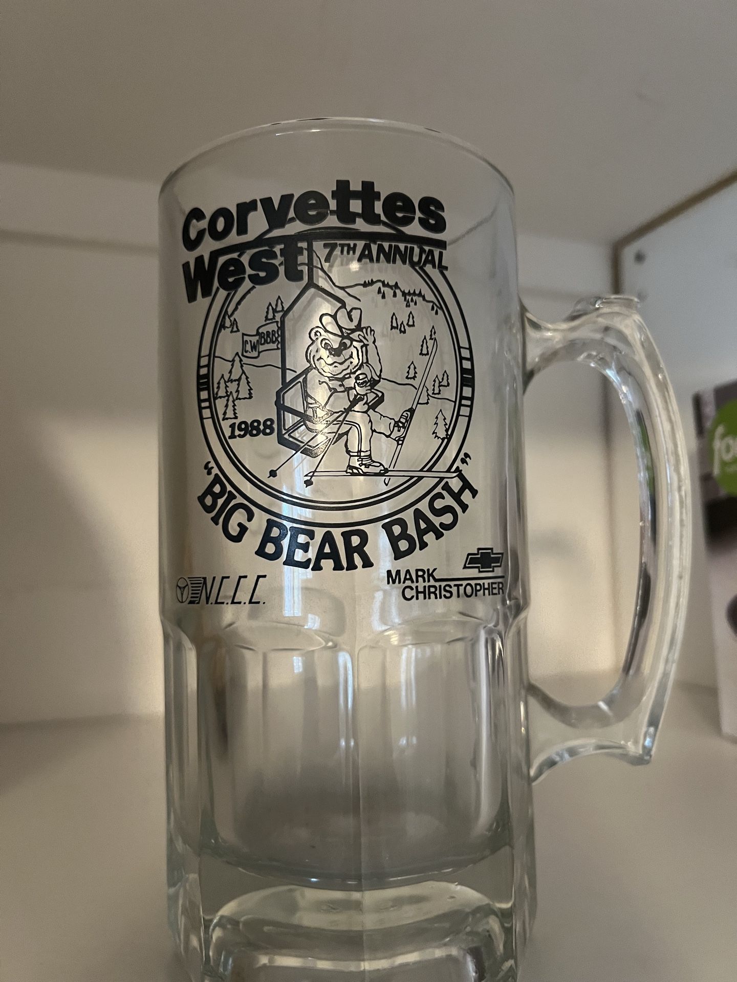 Moving sale - Vintage collectible glass beer mug. From the Corvettes West 7th Annual Big Bear Bash in 1988. Has cool skiing bear graphic and Mark Christopher Chevrolet logo. About 16.5 cm tall. Great for car enthusiast or mug collector.