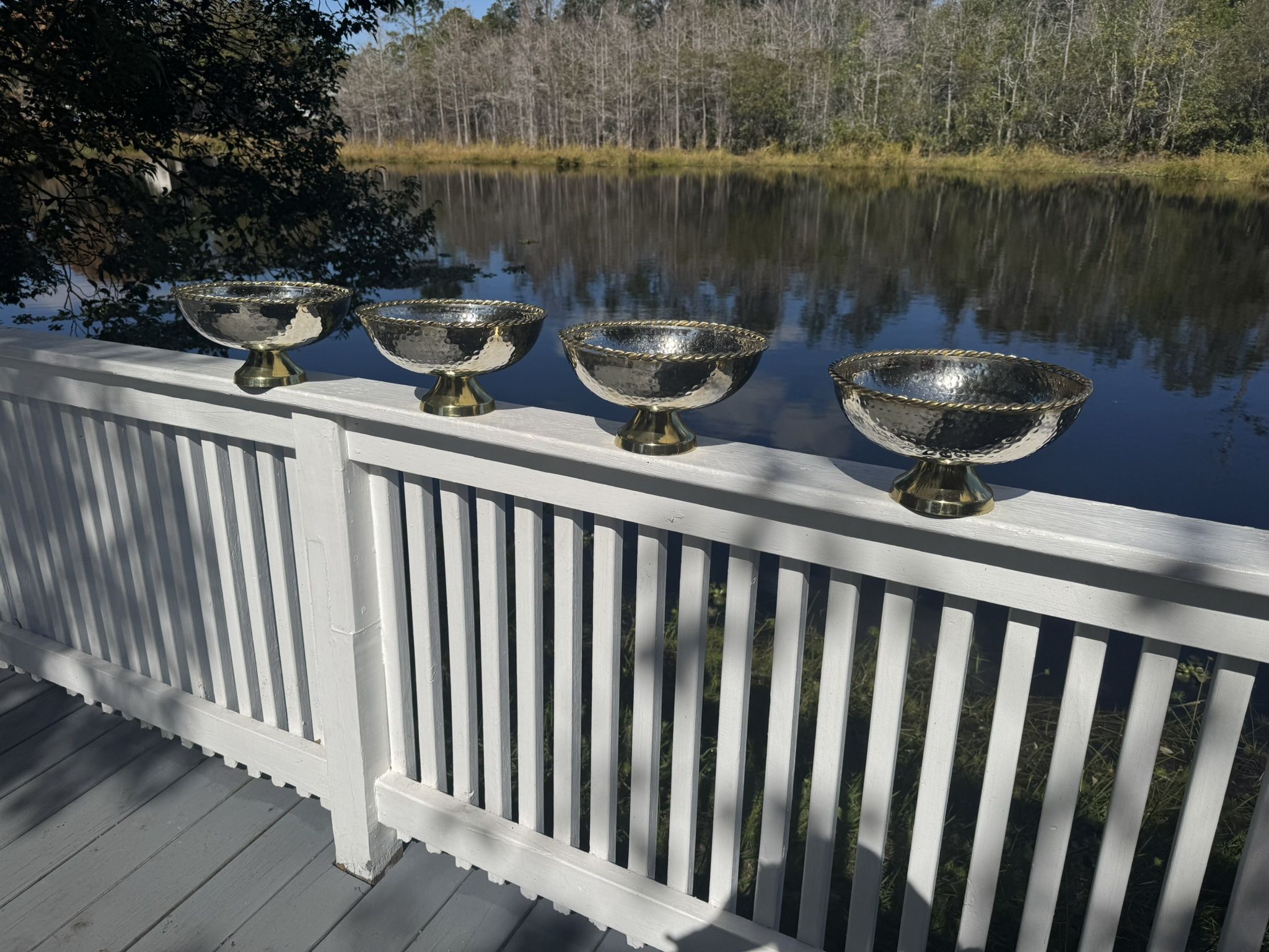 Set A Four Hammered Metal Pedestal Bowls With Gold Trim Centerpiece, Decor