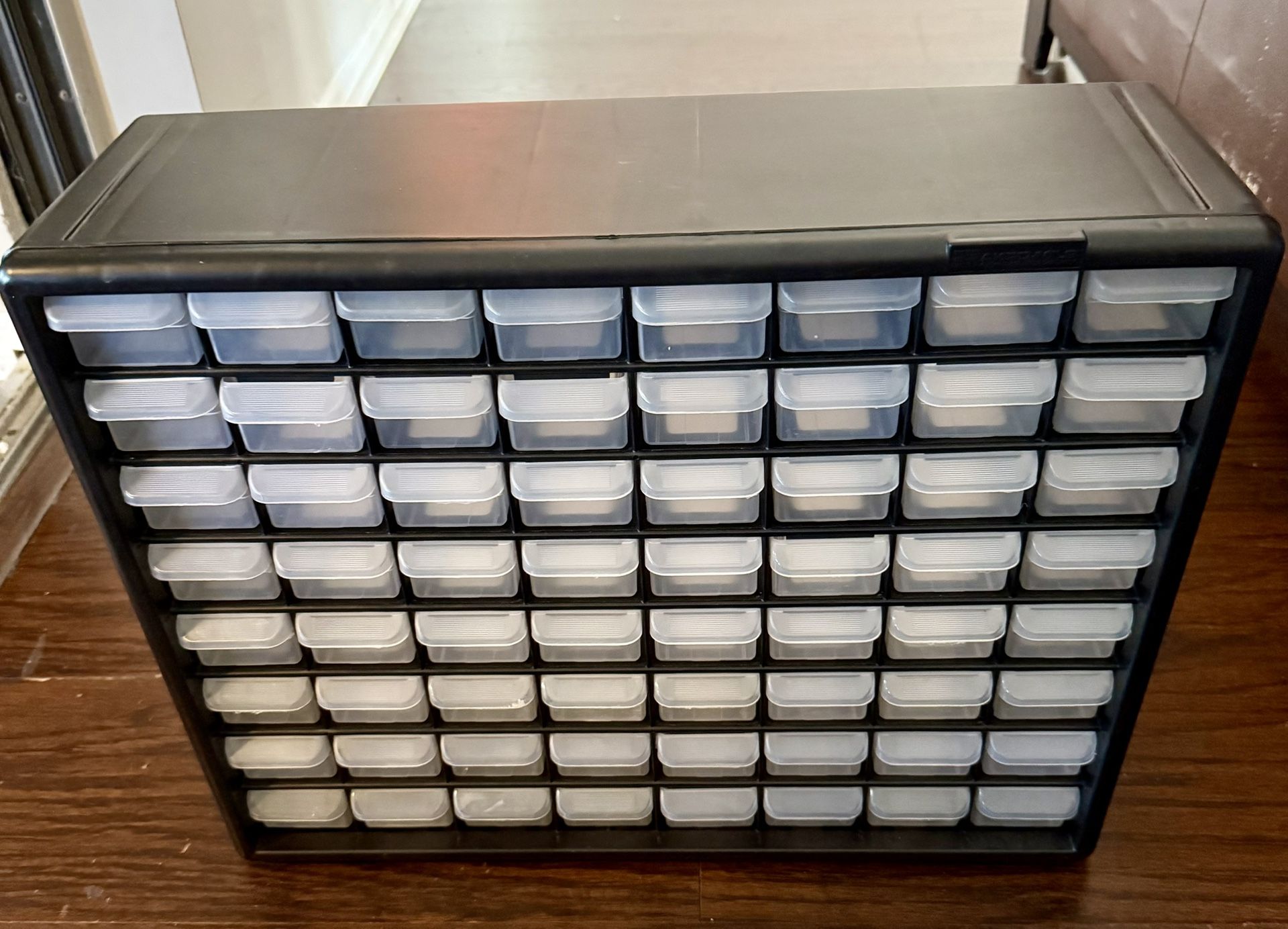 Gently used, like new. 4 available. $40 each Stackable or wall-mountable design offers flexible placement and future expansion Includes 64 clear drawers, giving you maximum sorting capacity and instant visibility of contents Compact footprint of 20 in. W x 6-3/8 in. D x 15-13/16 in. H fits shelves, benches, or wall-mounted setups Each drawer interior measures approximately 6 in. D x 2-1/8 in. W x 1-1/2 in. H, perfect for screws, small craft supplies, office bits or hobby pieces