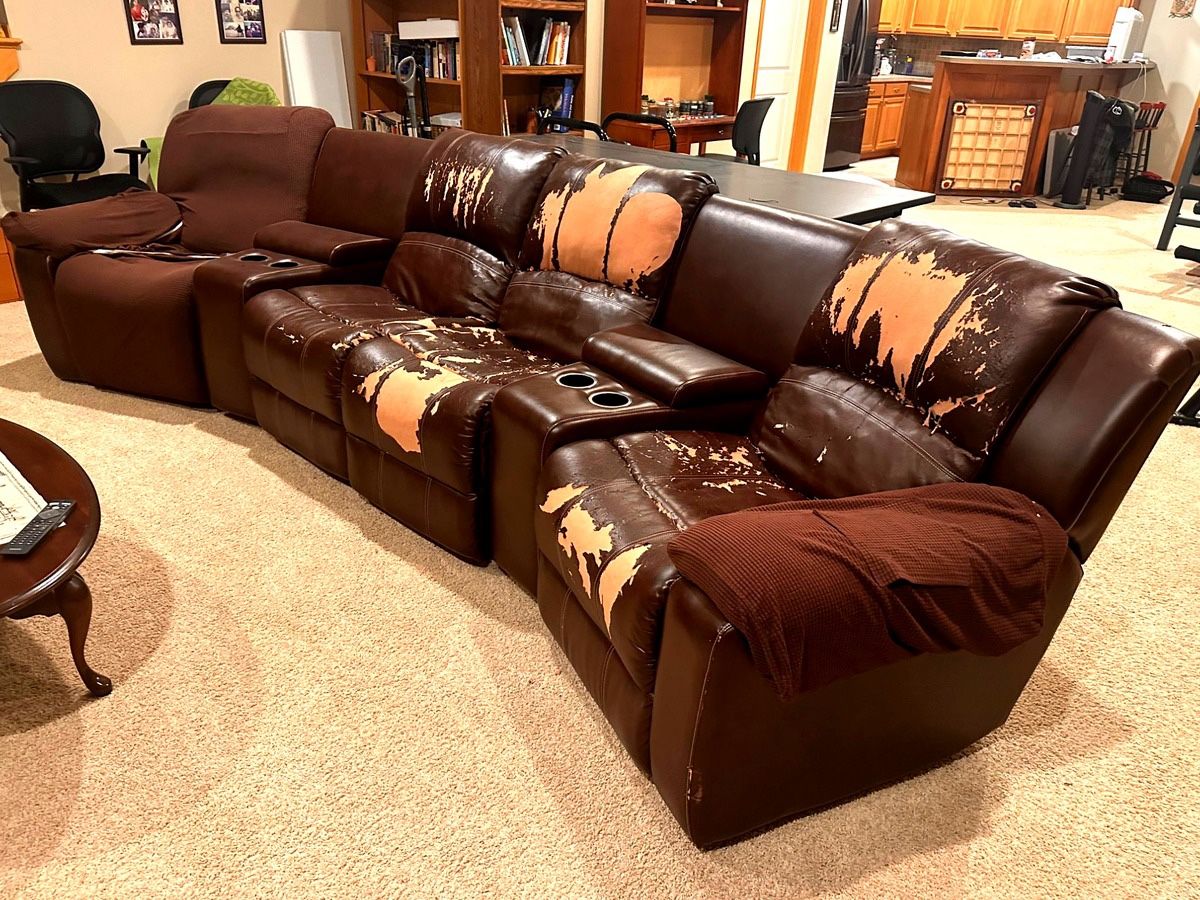 Must pick up — no delivery. Giving away this 5-piece theater-style reclining sectional sofa — completely free! Originally purchased for $1,600 from Carolina Furniture. It's a large, solid piece that reclines on both ends and has built-in cup holders throughout. Honest disclosure: The faux leather surface is peeling (cosmetic only). The frame, mechanics, and cushions are all solid and fully functional. Has been thoroughly cleaned. Re-cover or reupholster it and it'll be good as new! What you get: ✅ 2 reclining end seats ✅ 1 loveseat center section ✅ 2 console sections with cup holders ✅ Seats 5+ people ✔️ Can be fully dismantled for transport ✔️ Cleaned and ready to go ✔️ Great for basements, game rooms, or reupholstering projects Pickup rules: - Bring help & a truck or large trailer - First confirmed pickup time gets it - Must pick up within 48 hours of claiming - No holds without a scheduled time Message me to arrange pickup!