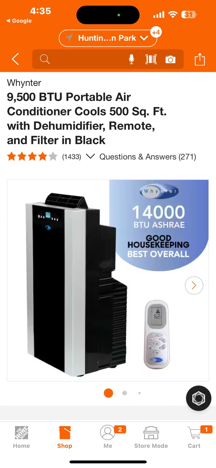 Whynter 9,500 BTU Portable Air Conditioner Cools 500 Sq. Ft. with Dehumidifier, Remote, and Filter in Black