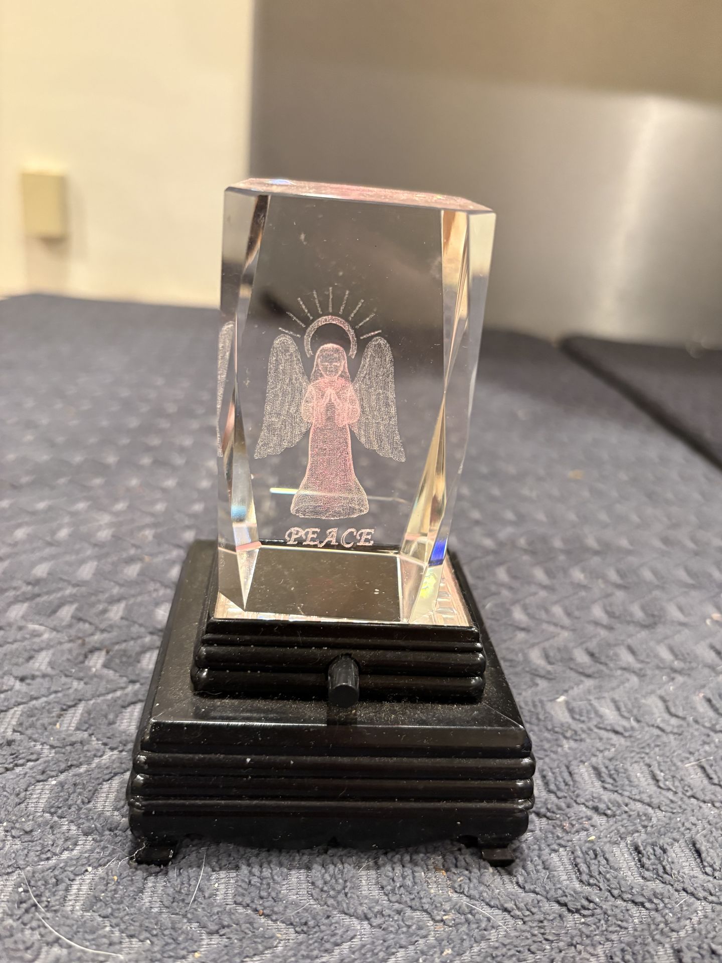 In good condition Heave Crystal on lighted base Hologram effect with angel of peace 5 1/4 inch high