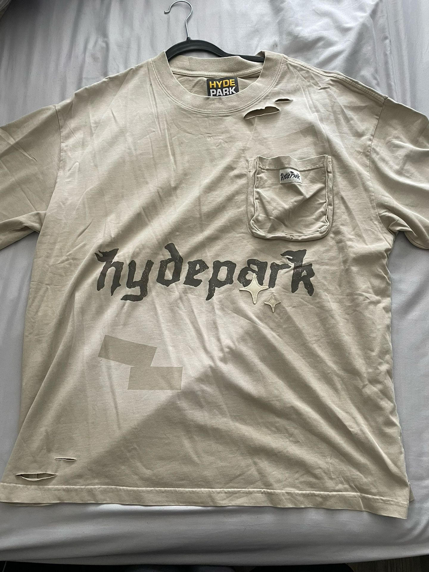 Got a khaki brown Hyde park t shirt in XL ‼️BRAND NEW WITH TAG‼️ Retail is 90$ only asking 30 obo #icecream #illuminati #kash #moschino #pure #purplejeans #sp5der #spider #market #civilla #yungla #darcsports