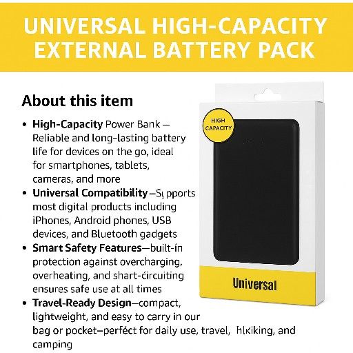 π High-Capacity Universal External Battery Pack Stay powered up wherever you go with this powerful and portable Mobile Power Bank β perfect for travel, emergencies, or daily charging needs! --- β Key Features: High Capacity β Long-lasting battery backup for your devices (approx. 20,000 mAh). Solar Charging β Built-in solar panel for emergency sunlight charging. Dual USB Output β Charge two devices at once. Universal Compatibility β Works with smartphones, tablets, cameras, and more. LED Flashlight β Built-in flashlight for outdoor use and emergencies. Water & Dust Resistant β Durable design for outdoor and travel use. Compact & Lightweight β Easy to carry in your bag or pocket. --- π¦ Specifications: Output: 5V/1A and 5V/2.1A Input: Micro USB + Solar Battery Type: Lithium Polymer Solar Panel: 5V/200mAh Material: Eco-friendly ABS + Silicone + Solar Panel Includes: 1x Power Bank, 1x USB Cable