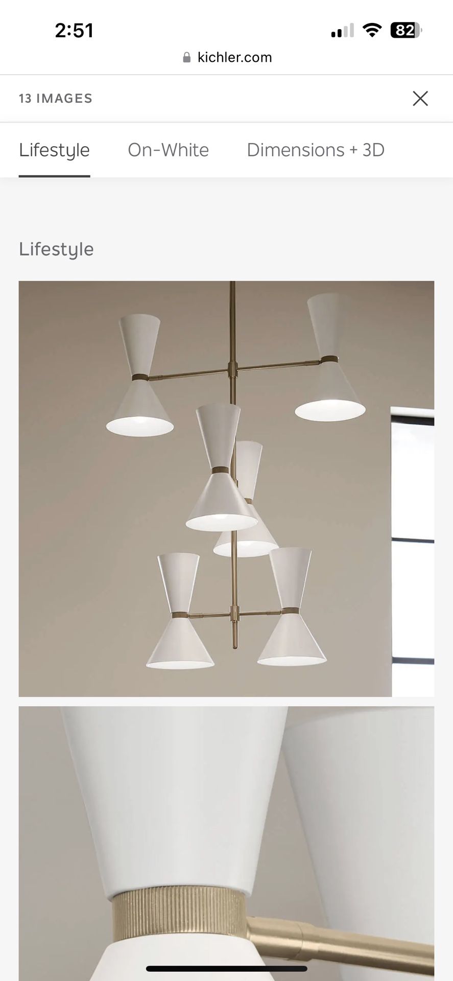 Paid $1,675 The Phix 12 light chandelier lets you choose your look with the included white shades that pivot as you wish. Light illuminates both up and down for a beautiful effect. With an elegant champagne bronze finish, Phix exudes a modern aesthetic that's edgy, yet livable. A modern take on a classic mid-century silhouette, Phix is the signature piece your space craves A warm, muted brushed gold finish, champagne bronze is elegant and timeless with a refined matte sheen Clean, crisp, and classic, the white shades brighten as they complement the refined champagne bronze Sloped ceiling compatible; must use minimum of one 12-in stem when mounting Perfect in a large foyer, high-ceiling dining room, or vaulted-ceiling family room Takes twelve E26 up to 60W G25 bulbs or equivalent LED bulbs What's in the Box: (1) Fixture, (1) Canopy, (2) 6-Inch Stems, (2) 12-Inch Stems, (1) Swivel, (2) Set of Shades, and (1) Mounting Strap. Bulbs not included.