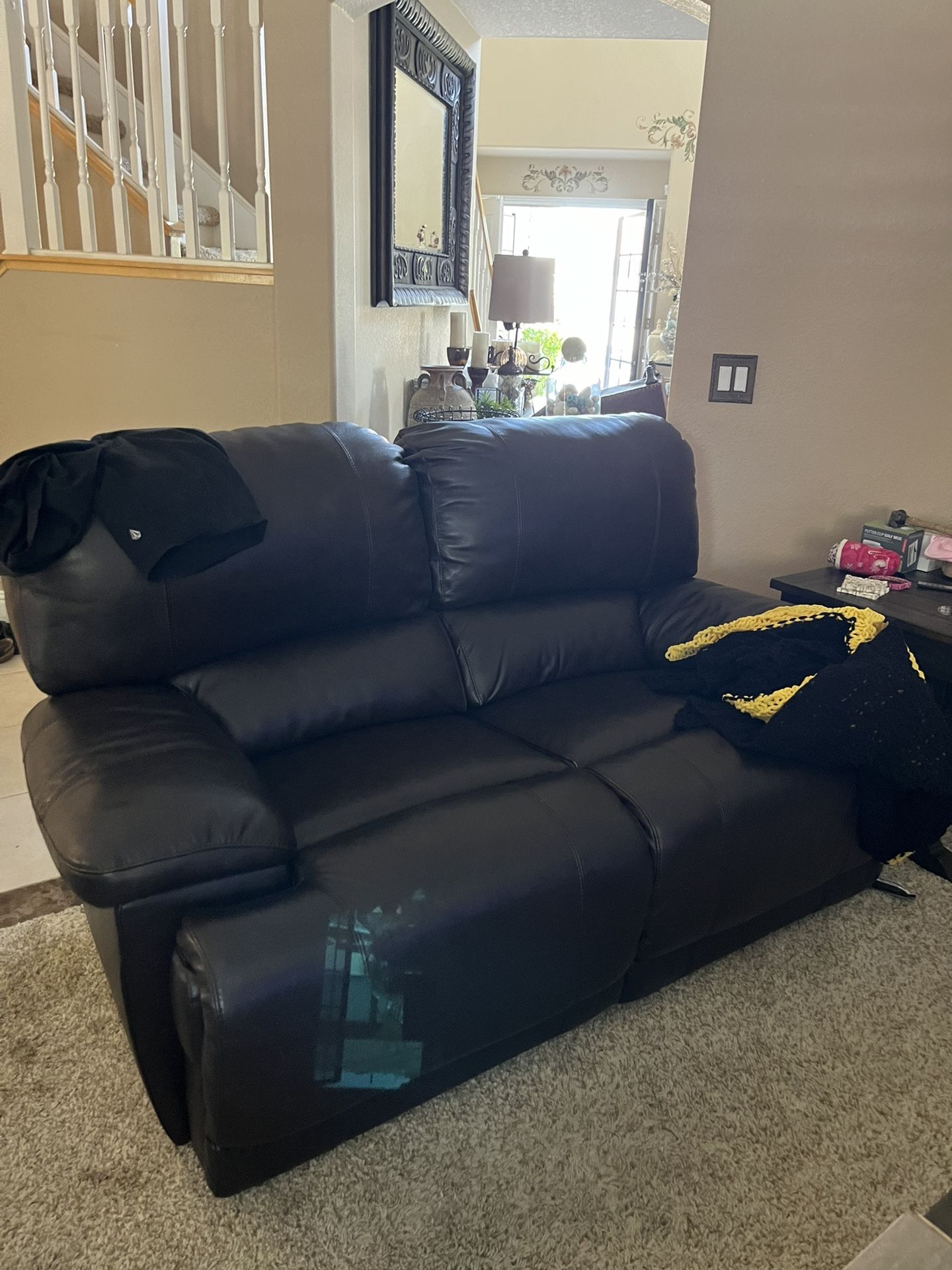 Gently used recliner leather couches, like new brown couch, corner shelves,wall shelves, vases, candle holders, and much more