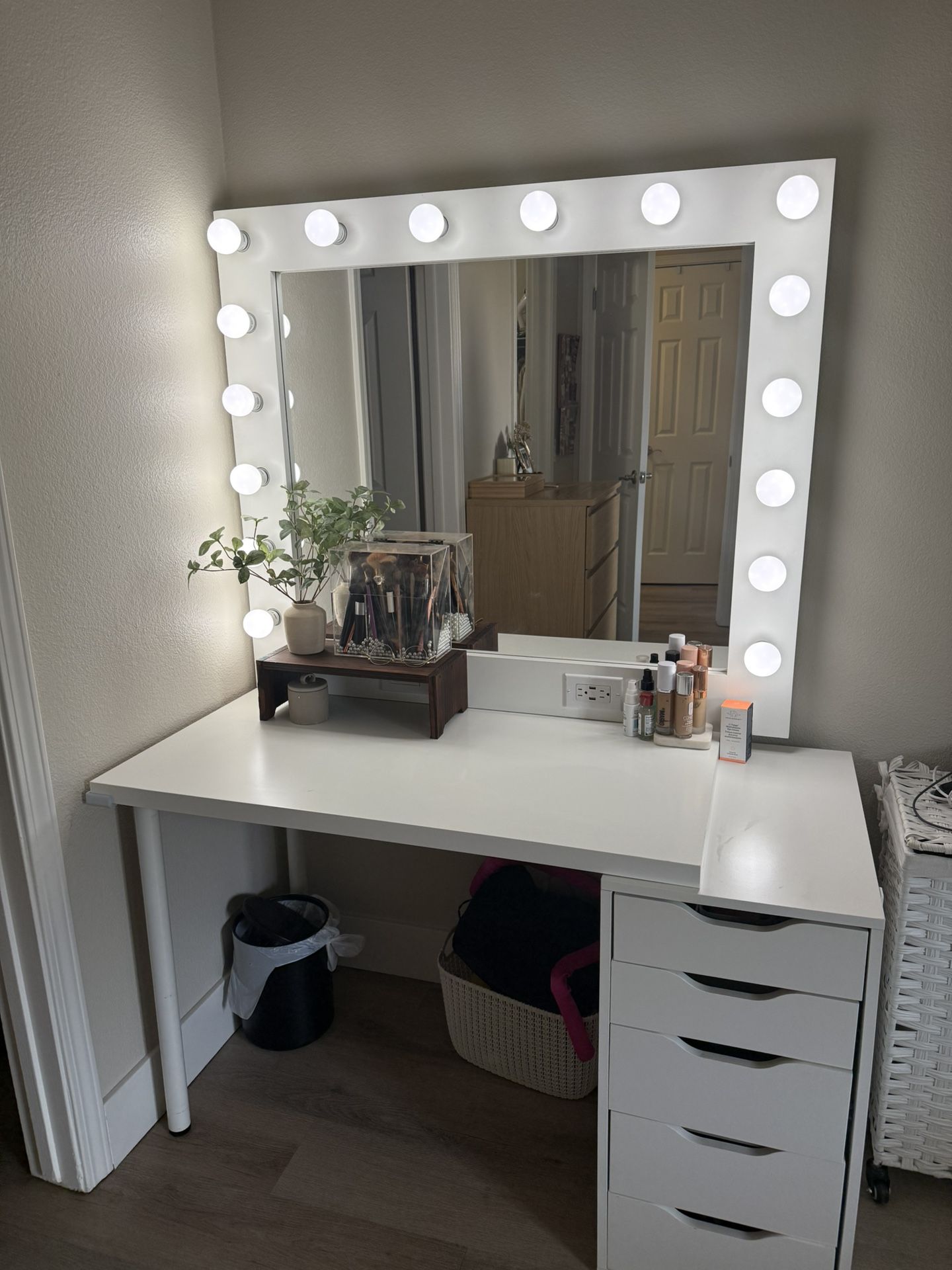 Vanity makeup mirror with desk and drawers. LED dimmable lights included. 2 USB ports. 2 plugs. Condition is very good. Pick up only