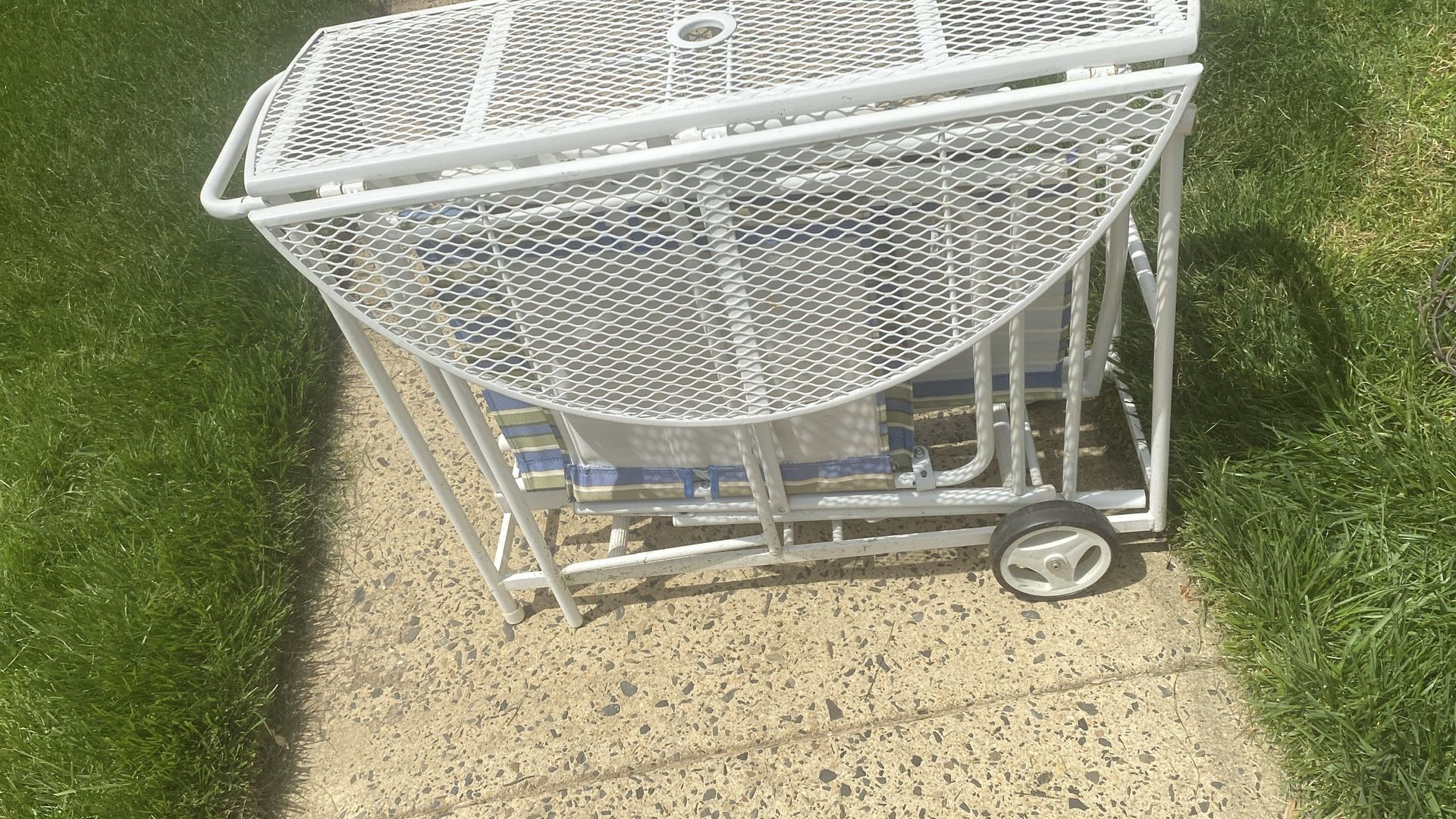 Portable White Wrought Iron Drop-Leaf Table with Two Fold-Out Chairs. Great Addition to any Deck or Patio. Whole for Umbrella as well. Sturdy Construction. Very Good Condition.