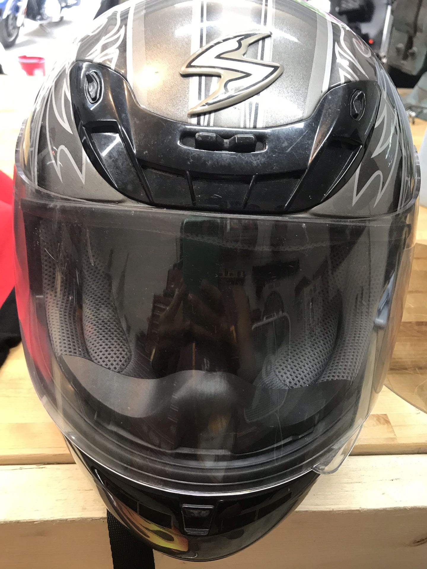Scorpion helmet size small full face. Clear visor on, have mirrored visor but it’s pretty scratched tho not noticeable while wearing $30