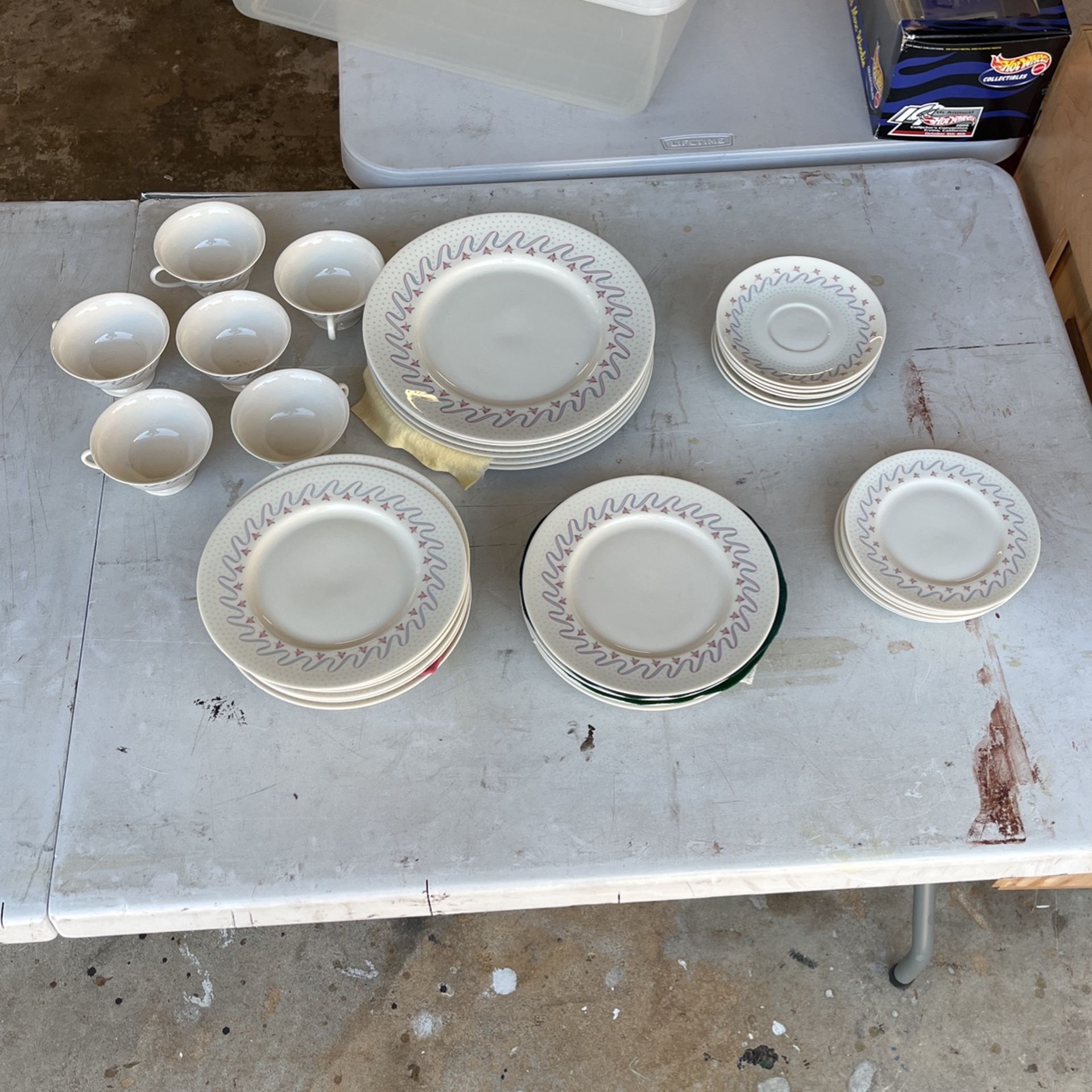 China dishes, plates, saucers, cups, etc. 6 pieces of each. Made in California. Everything in good condition. Asking $60 for the whole lot.