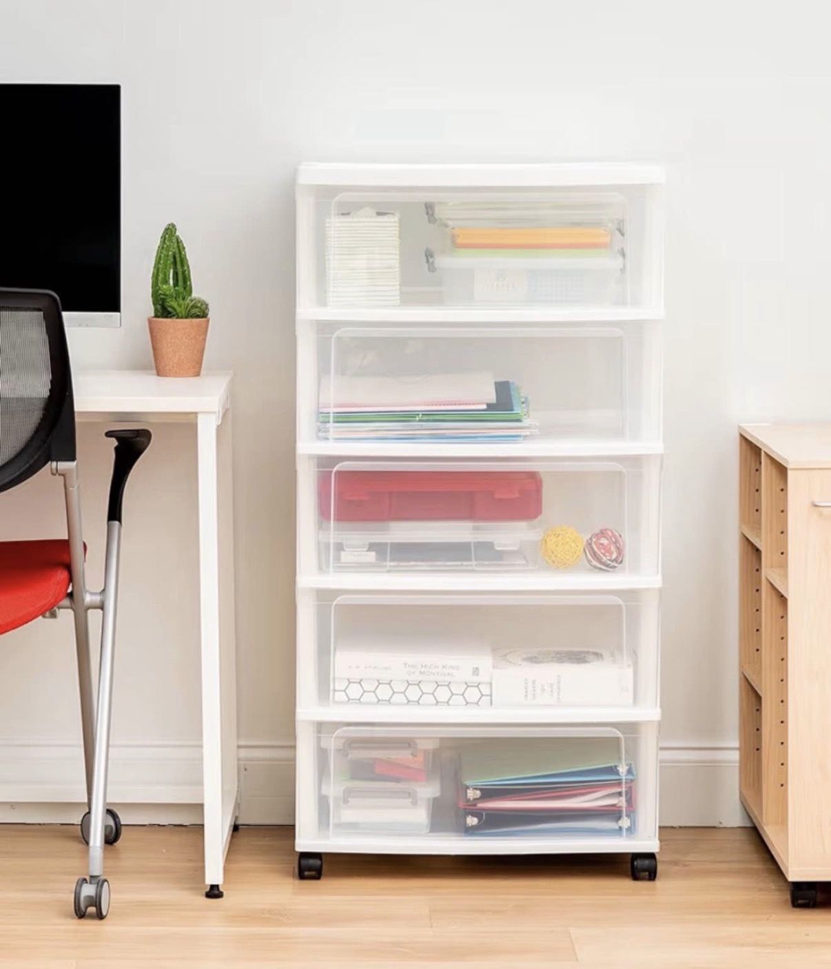 IRIS USA Plastic Drawer Storage Organizer Rolling Cart, with Wheels Casters, 5-Drawers, for Art Craft Supplies Bathroom Dorm Bedroom Laundry Room, Wide, White