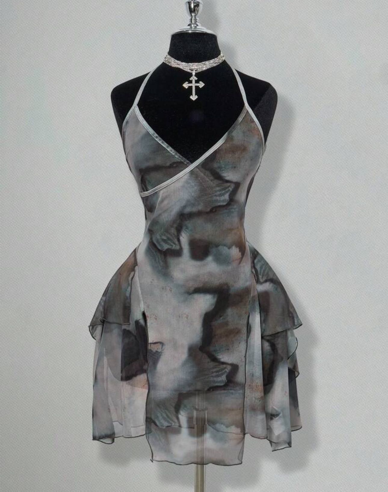 SHEIN ICON Mesh Print Sheer Asymmetrical Hem Halter Tie Waist Mini Dress