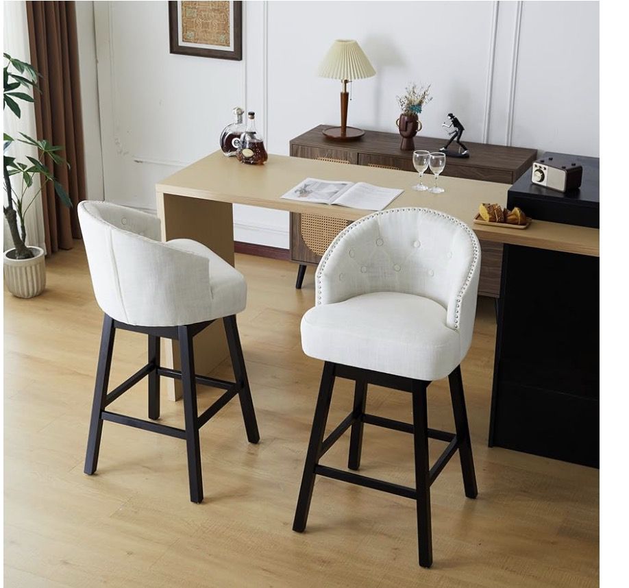 Swivel Counter Stools Set of 2, Upholstered Bar Stools with Backrest, Footrest, Solid Rubber Wood Frame, Black + Beige Suitable for Living Rooms, Kitc