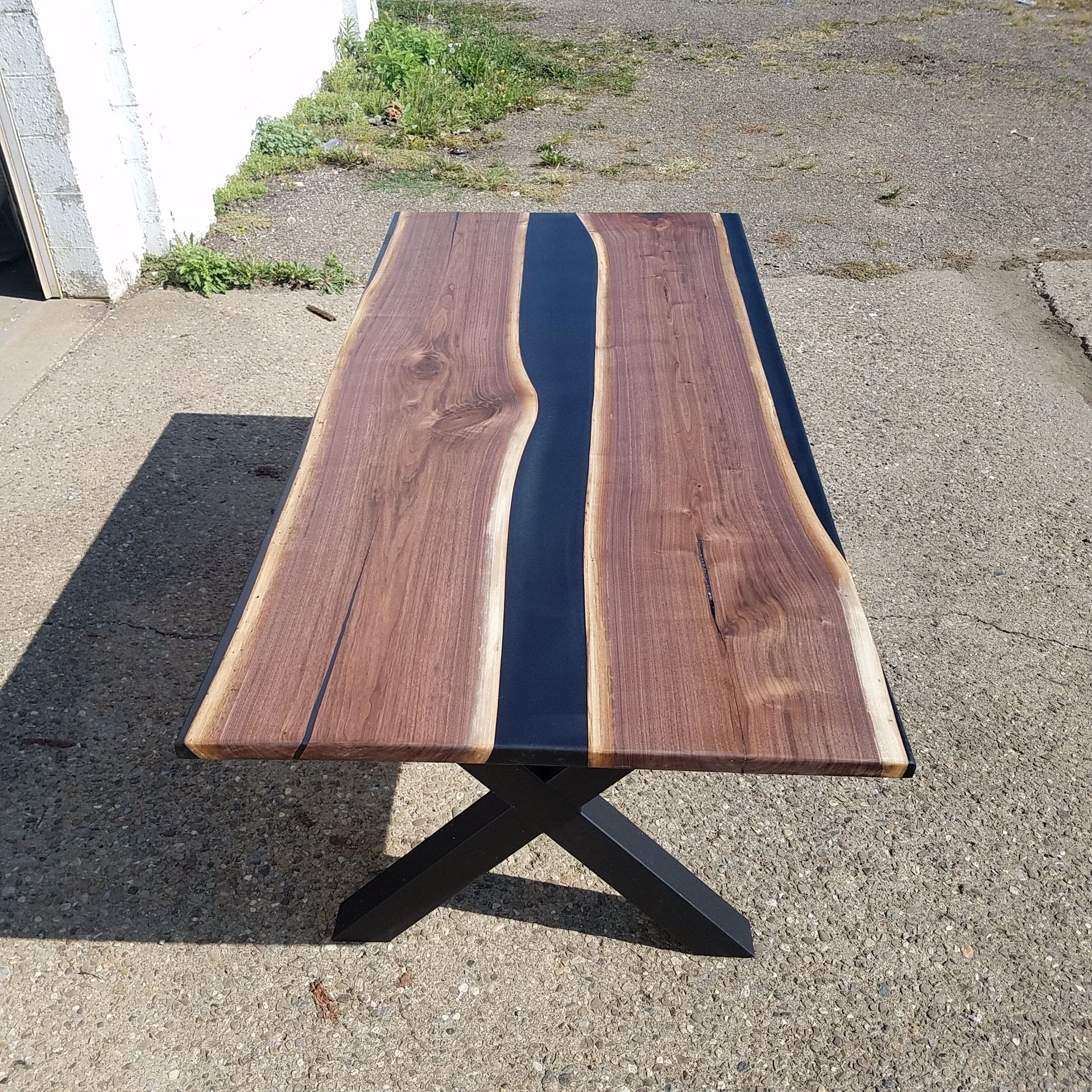 Ok All Done. 36”x80” Black Walnut Dining Room Tablel with Black River Epoxy and steel legs. Seats 6-8 people. Heavy Duty. $3,500. We can make any size table that you like with any color river resin running through the table. Onto the next project…..