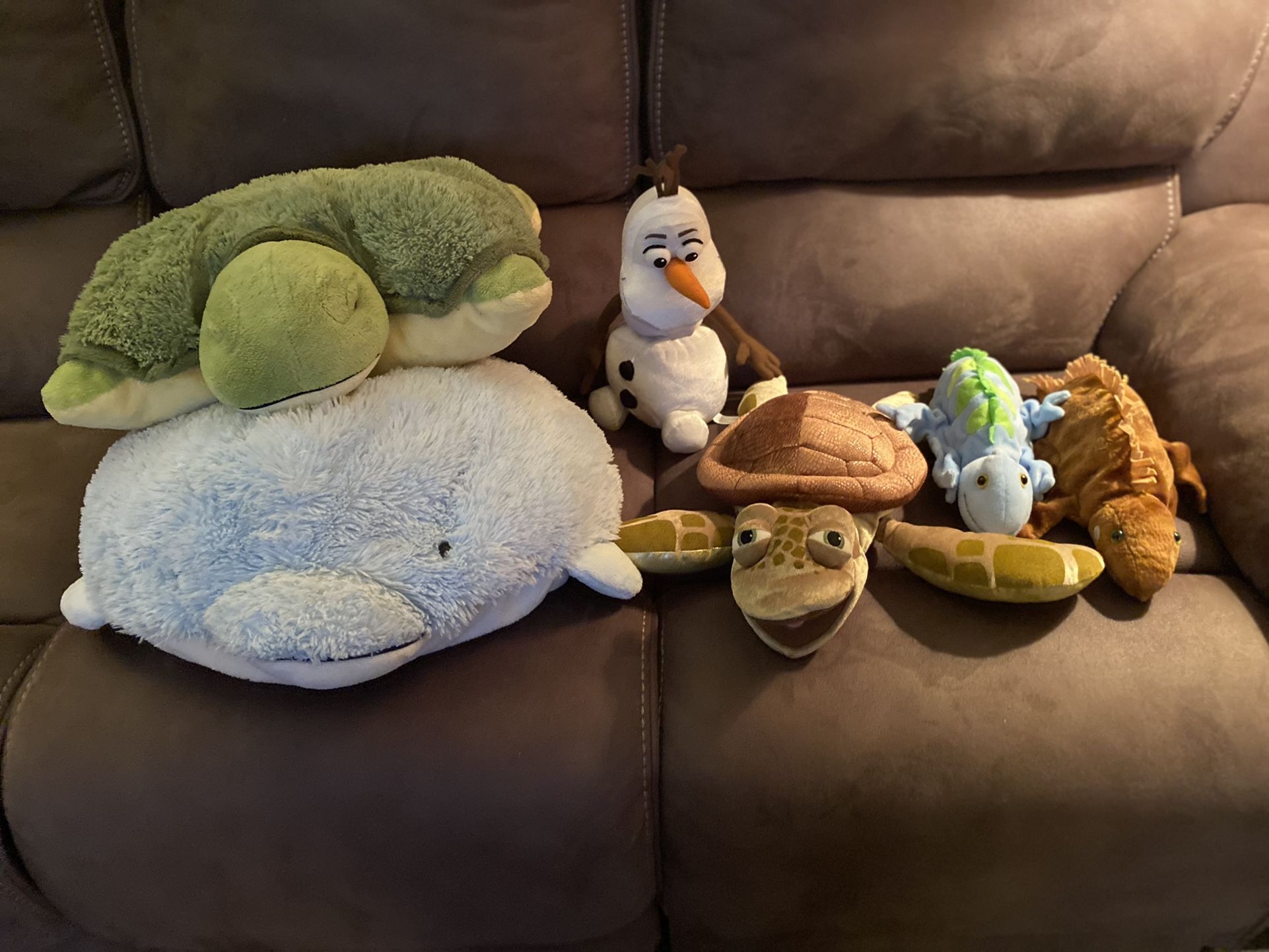 Two pillow pets, one talking Crush puppet from Finding Nemo, two dinosaur puppets, one talking Olaf from Frozen. 5 for $20 or $5 each. Clean smoke free home. Open to offers.