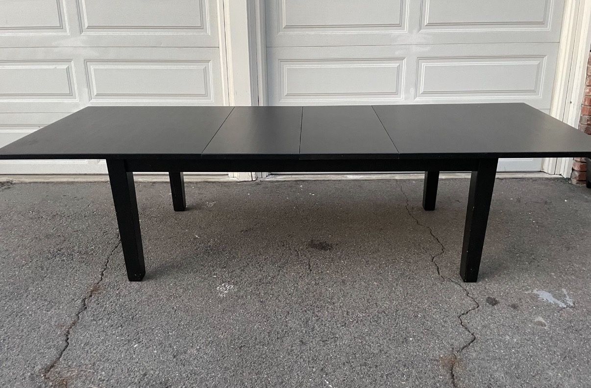 Black dining / kitchen table Solid wood and sturdy. Table without leaf is 41 in x 79 in Table with 2 leafs is 41 in x 116in *option to use only 1 leaf or 2