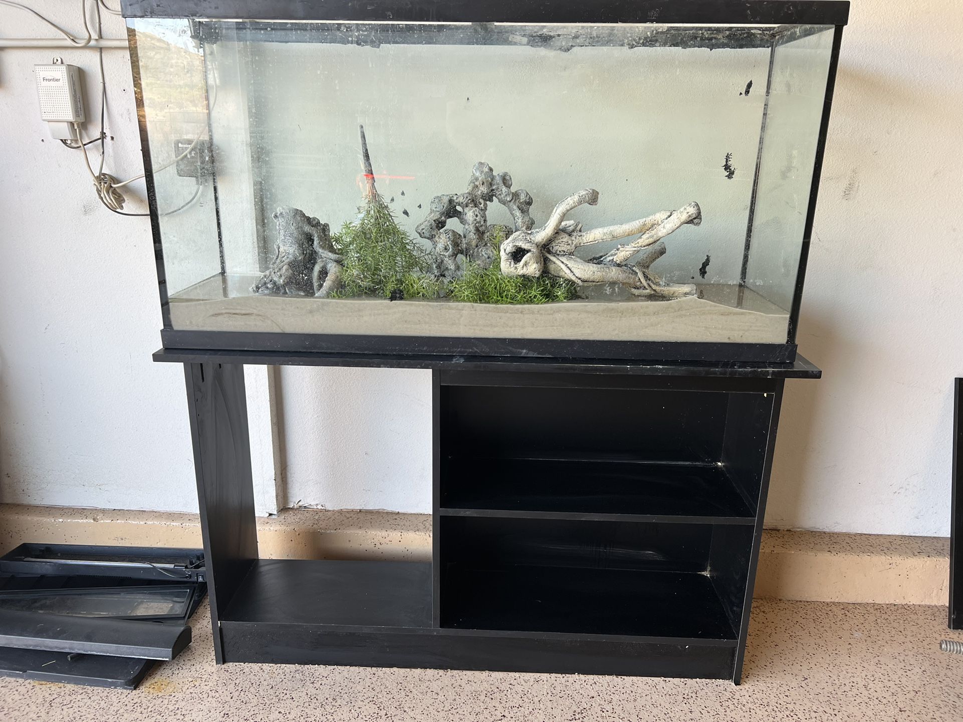 Includes led lights, high quality Fluval heater, sand, decorations, and overhanging filter. In great condition, love this tank because it is higher than most standard 50-55 gallon tanks and looks amazing when running. Door on stand is not mounted, but can easily be put on, it is not broken. Overall really great condition.