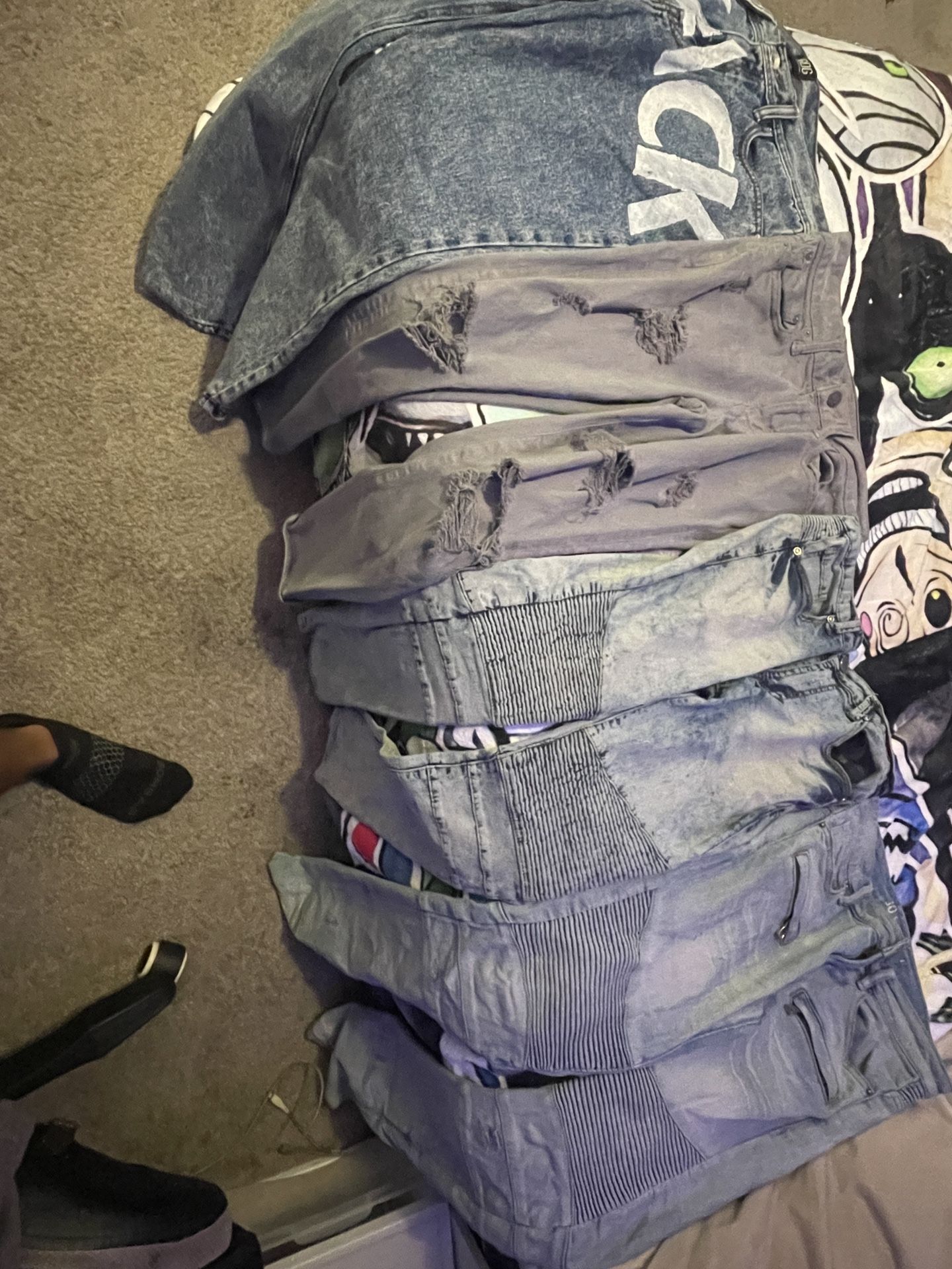 Boys pants most of them are slim most of them are normal fit. Sizes are like 28-30slim,29-32. All of them are washed!!. Selling them 7$ a pair.