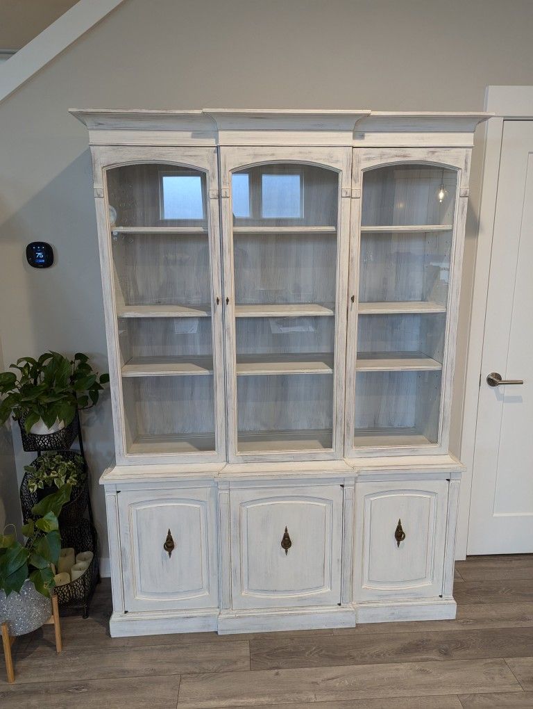 Beautiful large multi-use cabinet. Solid wood. Heavy. Most shelves are adjustable in height (middle shelf behind glass is not). Dimensions: -6' 6" tall -16.5" deep -4' 8.5" wide Buyer picks up. Cash only. Sold as is. Sale is final.