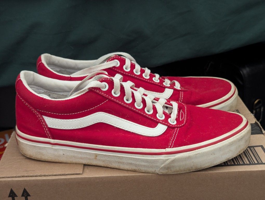 Men's 9.5 Red old school lowtop Vans, lightly worn. The soles and insoles are in excellent condition, the fabric is not faded or stained. The white trim is slightly worn and discolored from use, but could be restored to its former glory easily. Best cash offer takes it, pickup in West Charlotte/Oakdale only