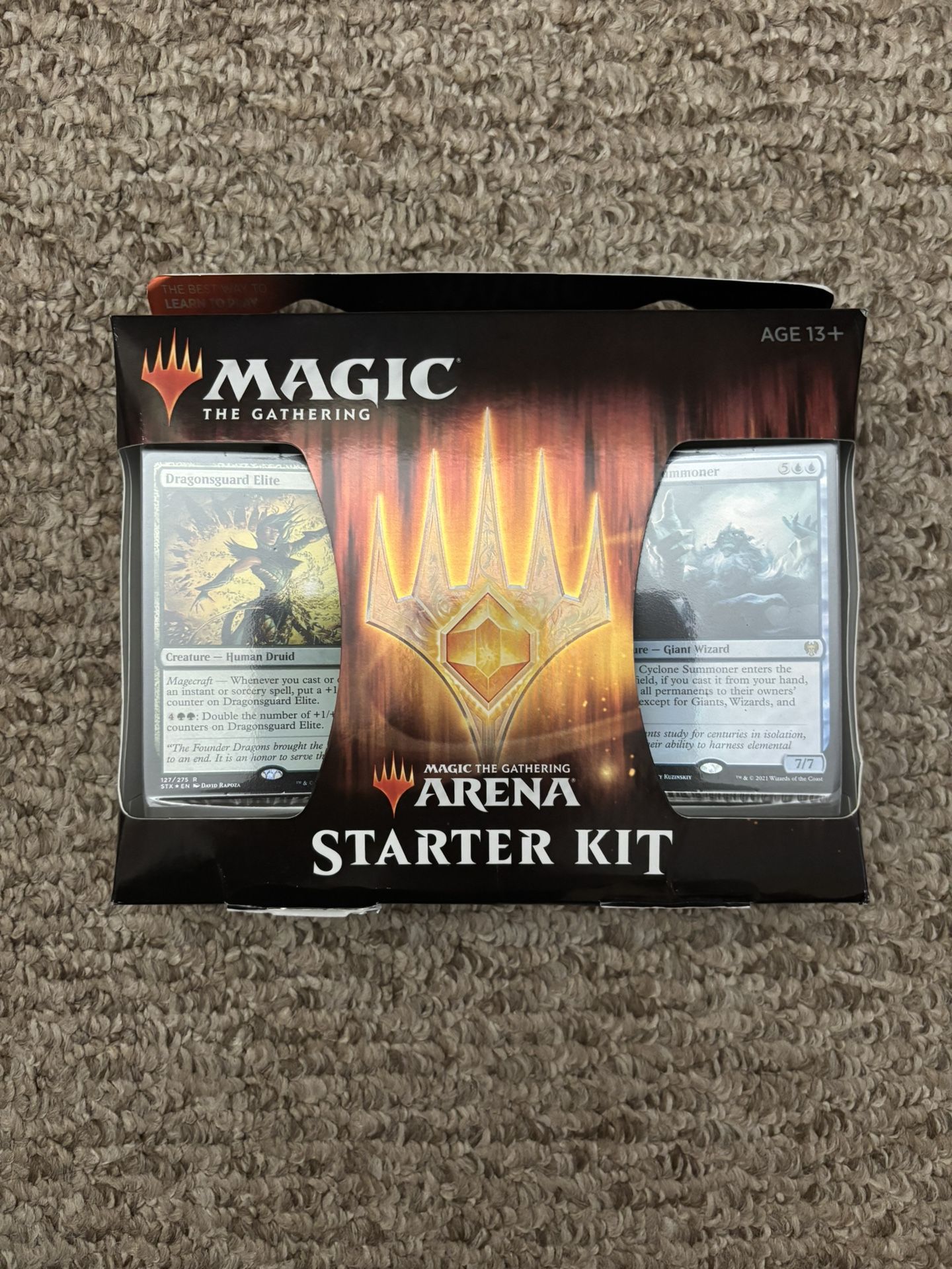Selling an unopened Magic The Gathering Arena Starter Kit. The box is still sealed and has never been used, all cards and materials inside are untouched. This is a great set for beginners, collectors, or anyone looking to jump into MTG with ready-to-play decks. Includes everything the kit normally comes with since it’s still sealed. Perfect for gifting, playing, or collecting.