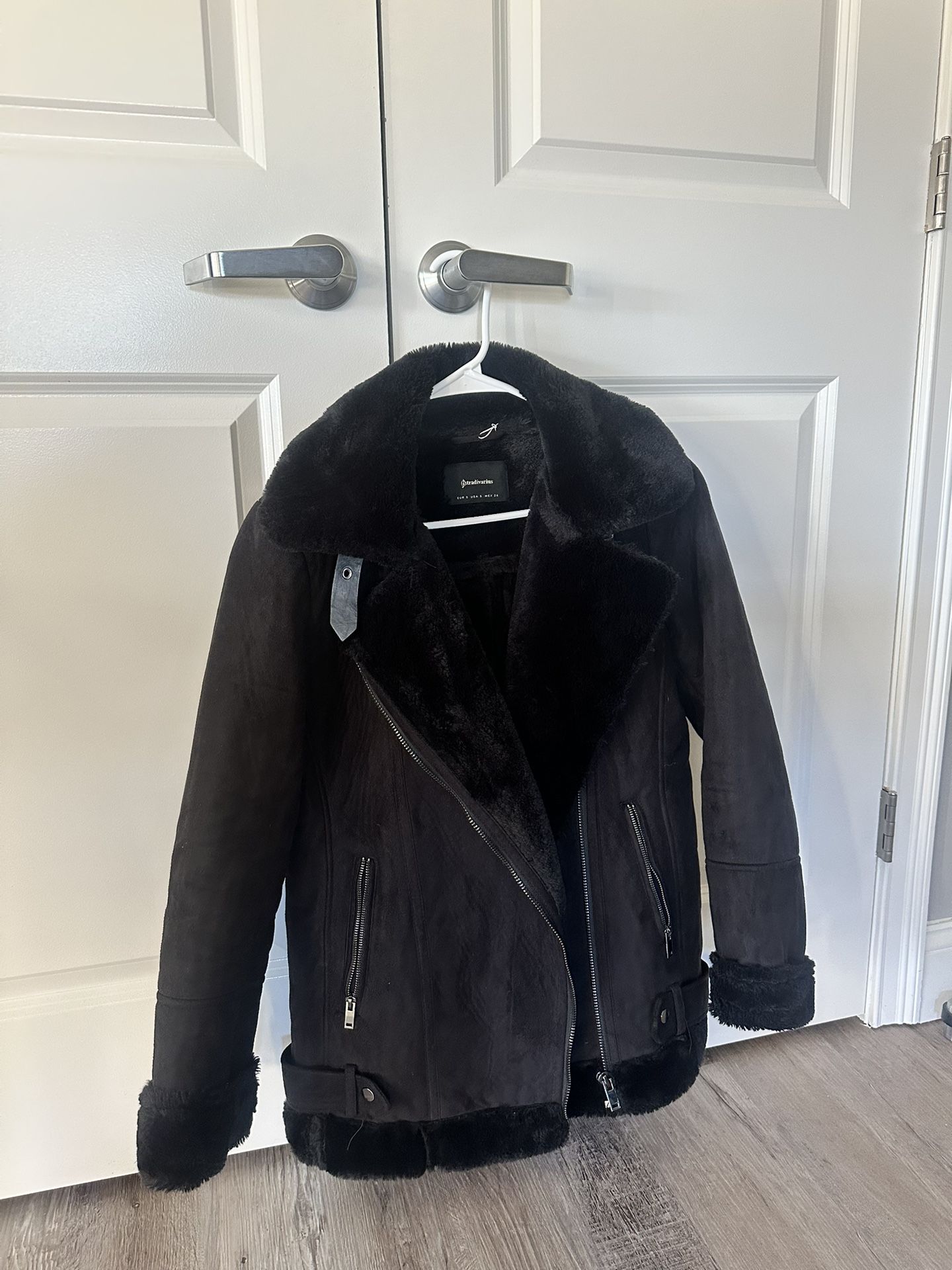 Super cozy and stylish black shearling-style jacket. Warm, soft on the inside, and perfect for cold days with a chic vibe. Small size ✨ Features: • Black color • Soft faux shearling lining • Biker-style fit • Zipper pockets • Great condition 📍 Pickup only, Revere