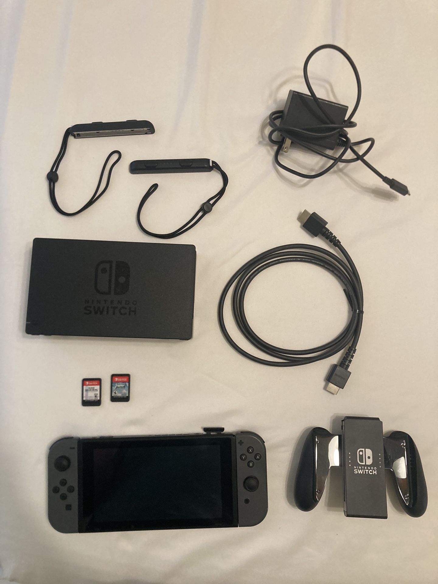 Nintendo Switch in excellent condition. No scratches on the screen as pictured. It comes with the original box and everything pictured except the games. I will sell Pokémon arceus and smash bros separate if desired.