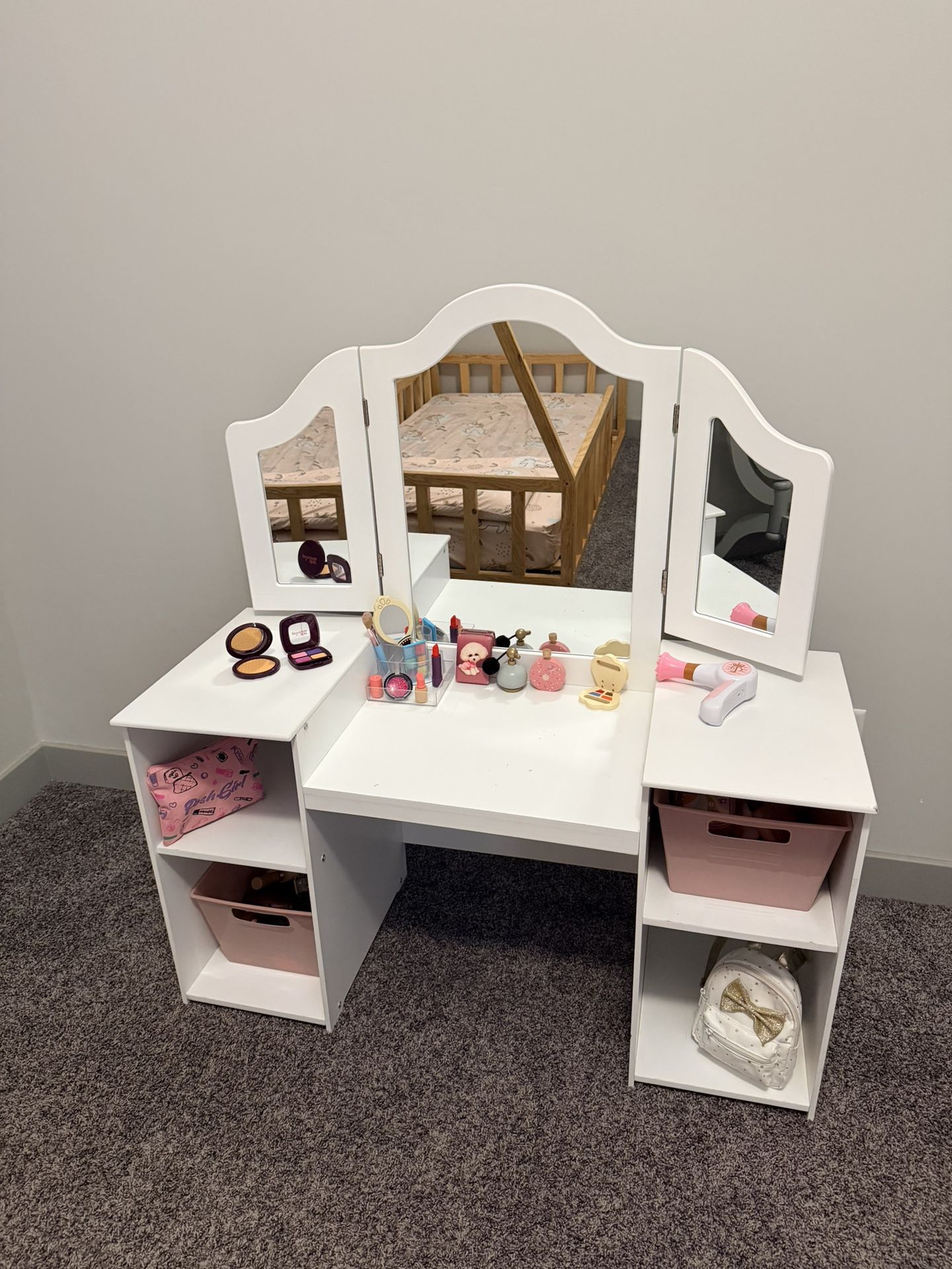 Accessories NOT INCLUDED. Selling just the vanity. Check out my other listings!!! I’m selling everything from a kids room! Great things. *MUST PICK UP. I’m located by MONTANA AND JOE BATTLE. 79938. Tambien Hablo español.