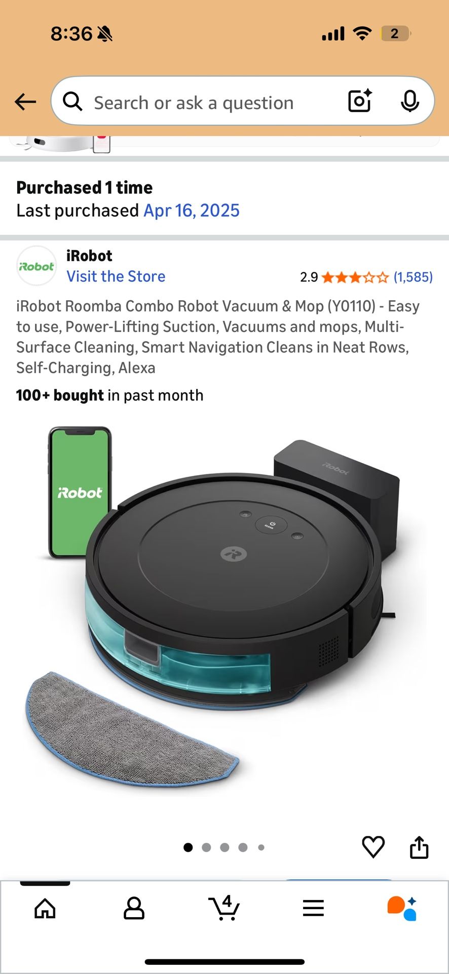 Used- very good condition. Comes with mop attachment that was never used, as well as charging dock and cord. Do not have the original shipping box, but comes with the manual/ instructions. Purchased in April 2026 and only used a handful of times.