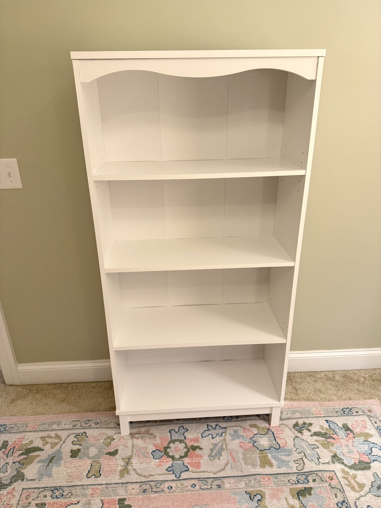Brand new fully assembled white bookshelf. Perfect condition. Unfortunately just doesn’t fit our space. Pickup only. Dimensions: 29.13”L x 11.65”W x 59.86” H