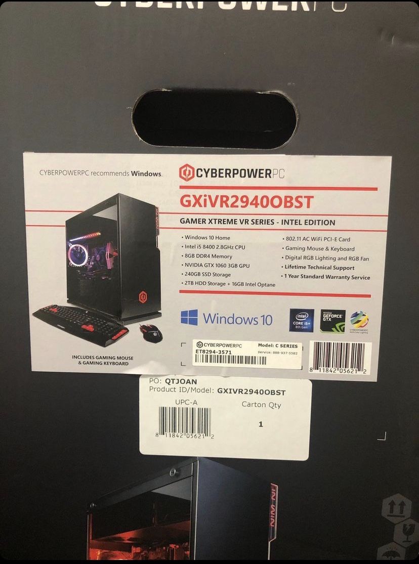Cyber power pc is collecting dust. It’s been stored away in it’s original box, since we all have better PCs to use. Its a good entry level PC. Willing to negotiate price. -gtx 1060 3gb -i5 8400 6cores/6threads -8gb ddr4 memory -240 SSD for fast booting -2T hard drive as a game drive -comes with keyboard and mouse. The whole bundle