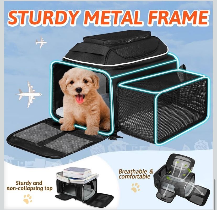 Pick up only in Murrieta. Top and Side Expandable Pet Carrier 18x13x9.5 Inches Southwest Airline Approved, Soft-Sided Carrier for Small Cats and Dogs with Locking Safety Zippers and Anti-Scratch Mesh. Only used one time. All sales are final.
