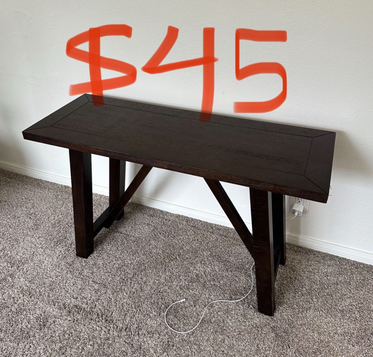 Dark brown wood. 40 inches long, 15 inches wide, 24 inches tall. $45 OBO in perfect condition