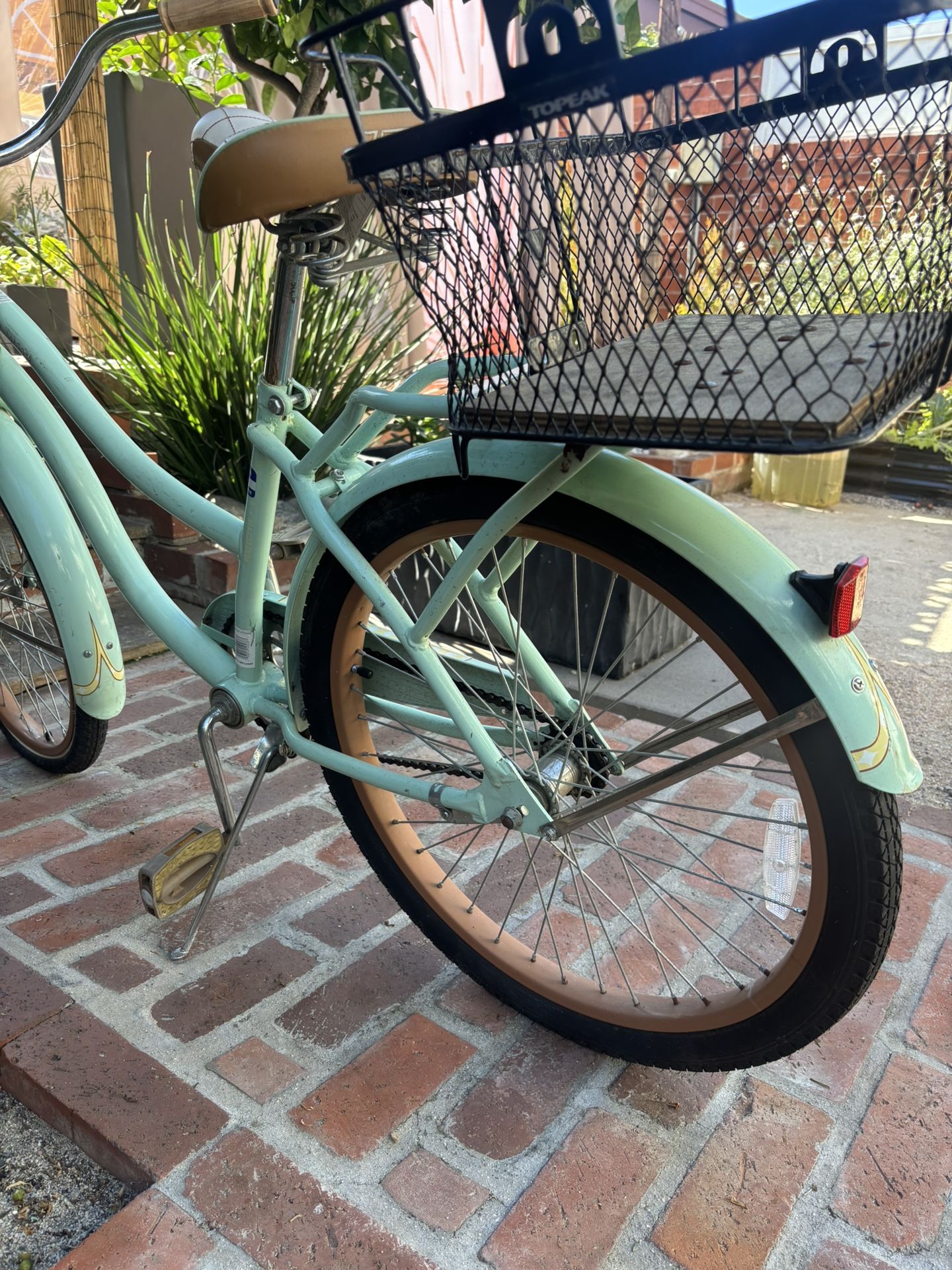 Comfy seat w/ quilted white padding. In good condition w/ usual wear and tear. Chain recently bike stire cleand and brand new back tire. Needs new Front tire, but other then that great bike. I loowered the price considerably so the $30 to fix the front tire is an easy repair! Just dont need any more. Bike has been in storage out of the weather. Custom wod grain handles. Price firm, accept Venmo or cash only. $75 total. Available for pick up around LAX.