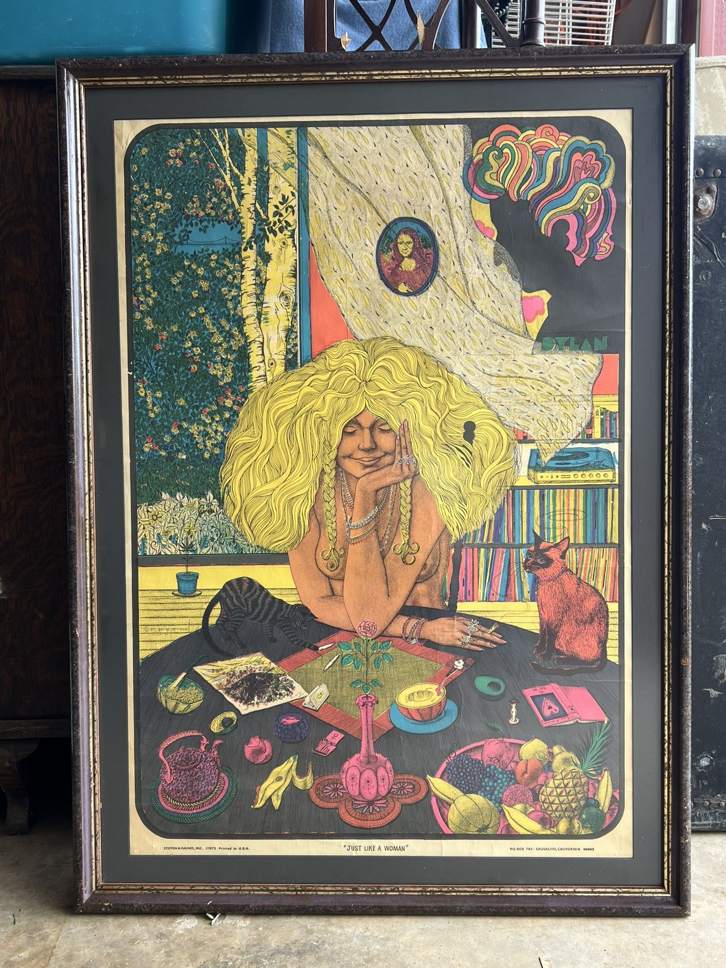 Just Like A Woman Vintage 1972 Black Light Framed Poster Art Bob Dylan’s Mona Lisa, Cat Lady