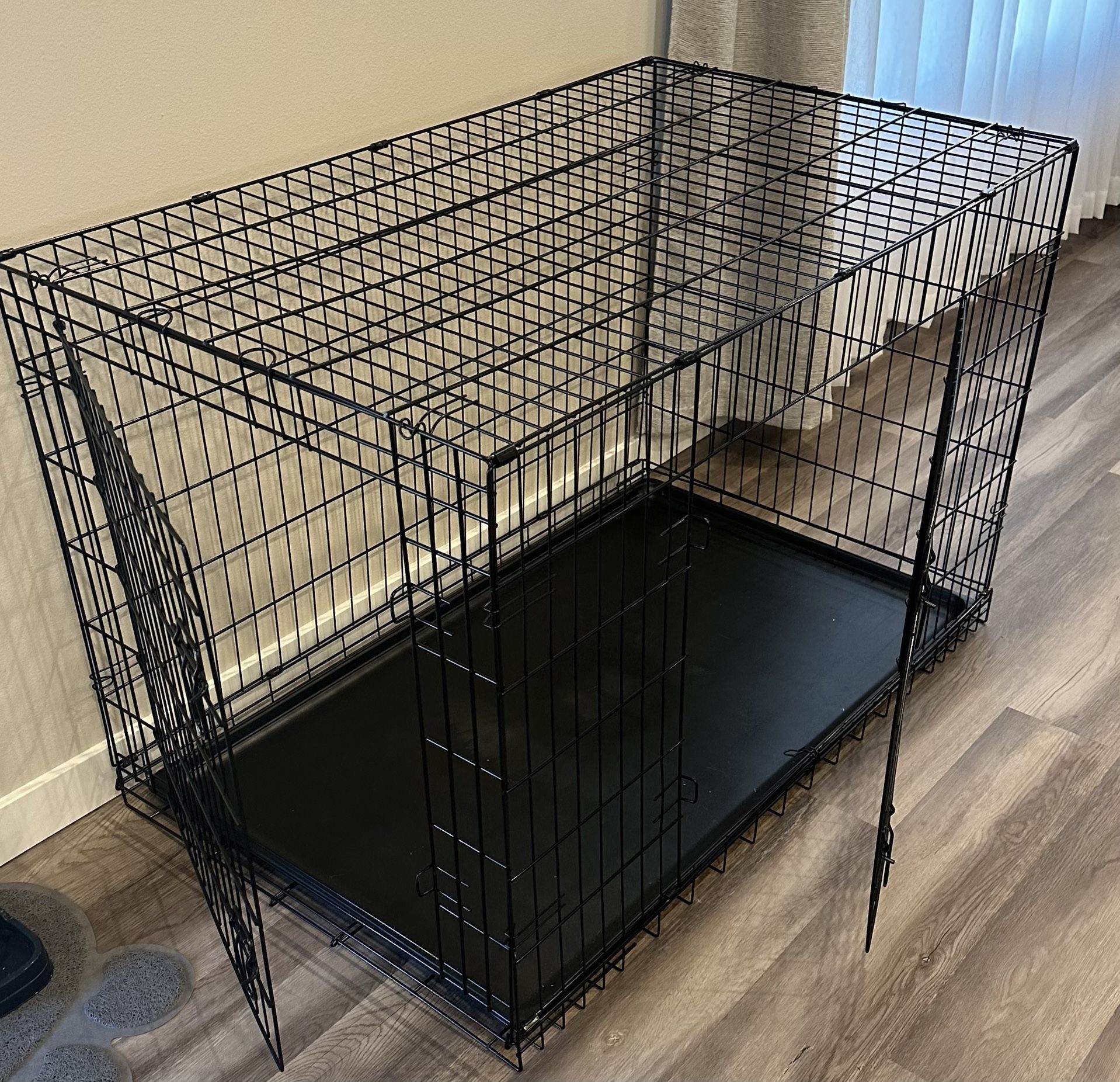 Lightly used large kennel in excellent condition. Kennel features removable floor that slides out for easy cleaning and 2 doors, folds flat for moving. Dimensions are 42L x 29”W x 31”H.