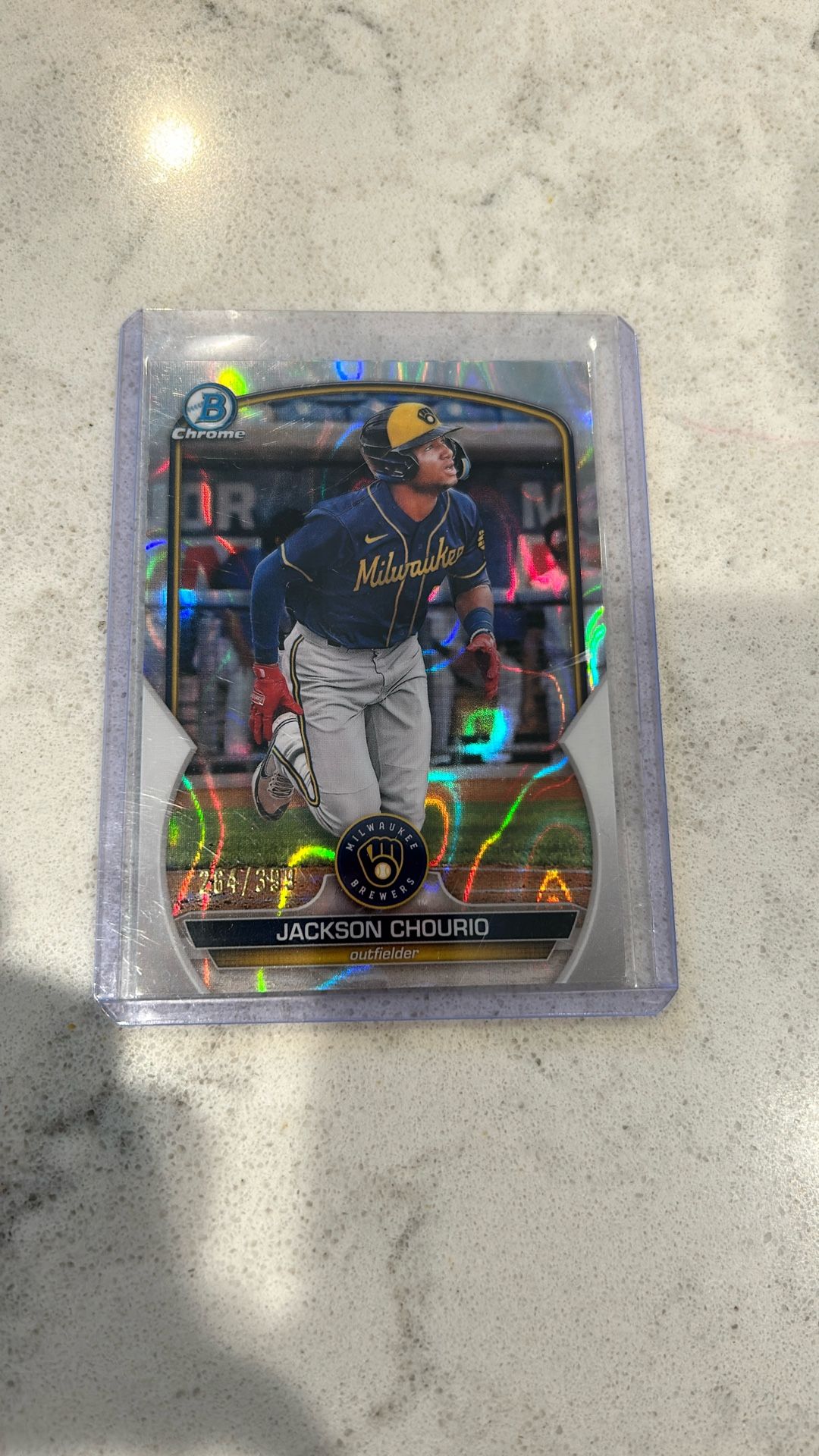 RARE Jackson Chourio Lava Refractor parallel from 2023 Bowman Chrome Prospects! Card #BCP-76 numbered 264/399 - limited print run makes this a premium card. Features stunning lava refractor technology with beautiful rainbow shimmer effects. Card is in excellent condition - sharp corners, clean surface, no damage. Chourio is one of baseball's hottest prospects and made his MLB debut in 2024. This numbered parallel is a great investment piece! **Details:** - 2023 Bowman Chrome Prospects - Card #BCP-76 - LAVA REFRACTOR parallel /399 - Numbered 264/399 - Excellent ungraded condition - Stored in protective sleeve & toploader - Top MLB prospect Perfect for serious collectors and Brewers fans! **Pickup in Lake Elsinore, CA** Cash only • Serious inquiries welcome Can meet at safe public location #JacksonChourio #Brewers #BaseballCards #Bowman #Chrome #LavaRefractor #Numbered #Prospects #Collectibles