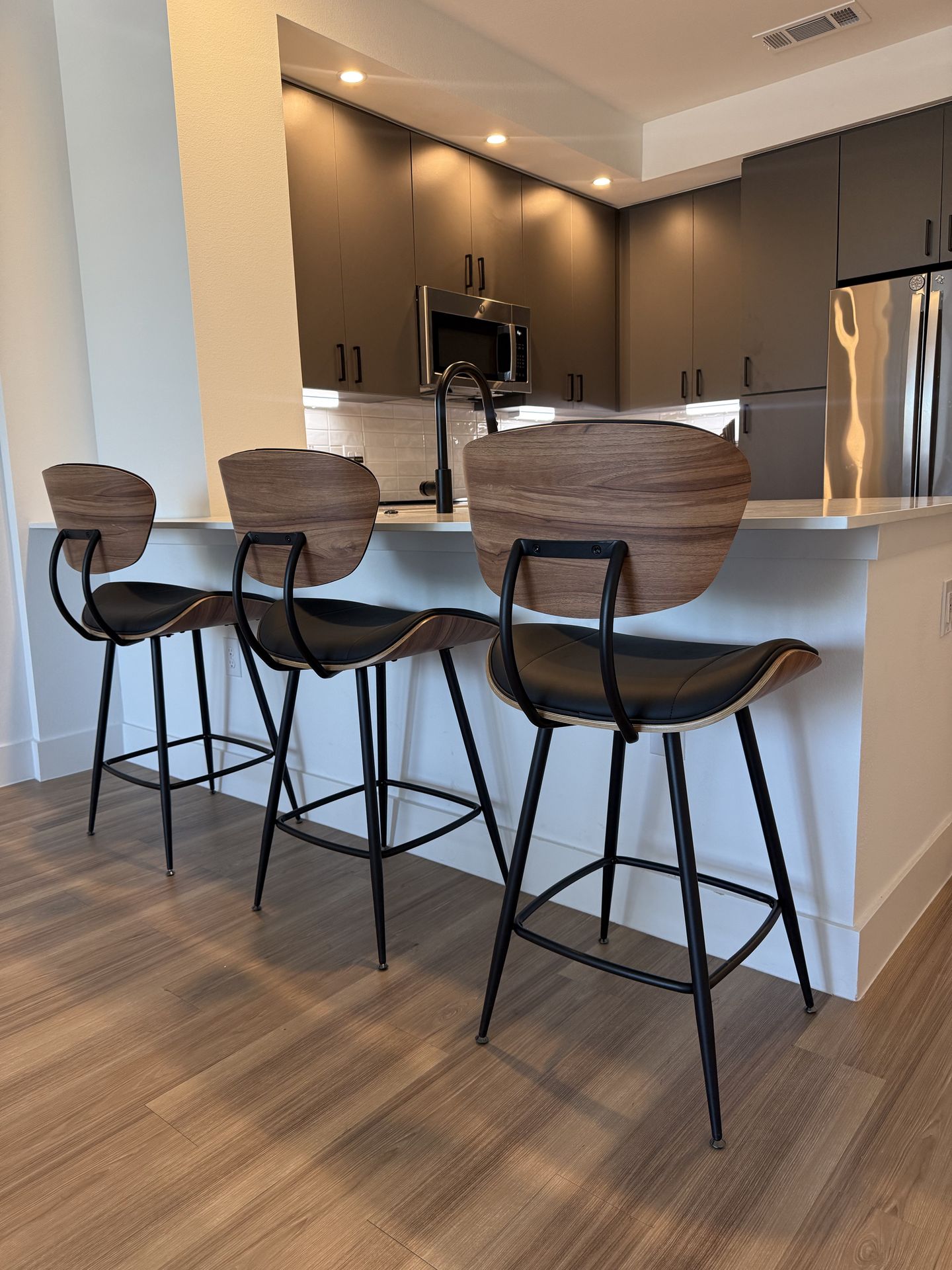 Modern Counter-Height Bar Stools – Set of 3 • Curved walnut backrest • Soft PU leather upholstery (easy to clean) • High-density foam padding • Chrome-plated iron frame • Strong 4-leg metal base with footrest • Adjustable feet — no wobble • 300 lb weight capacity per stool Modern, sturdy, and comfortable. Perfect for kitchen islands or home bars. Excellent condition. Pickup only. Serious buyers.