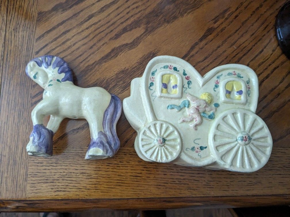 Antique ceramic pony and carriage. Beautiful soft glazed. Not sure of its origins. No markings. From 1930s-40s. No cracks or chips.