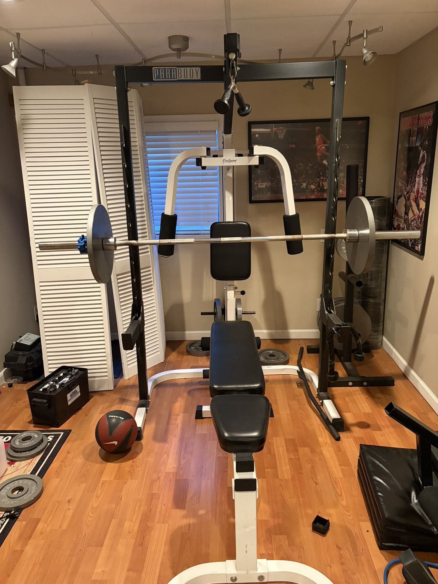 High-quality Parabody home gym system in very good condition. Includes Smith machine, adjustable bench, and lat pulldown/high pulley system. Extremely solid and smooth — built to commercial standards. ✔️ Parabody commercial-grade construction ✔️ Smith machine for safe lifting ✔️ Bench included ✔️ Lat pulldown / upper body cable work ✔️ Perfect for serious home gym setup This is a heavy unit — buyer will need to arrange transport and disassembly if needed.