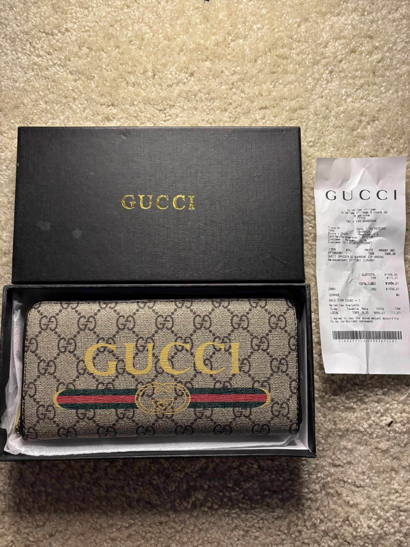 The Gucci Ophidia GG Supreme Canvas Zip Around Wallet features the classic GG Supreme canvas with green and red web detailing. It has a zip-around closure and multiple compartments for cards and cash. Pickup only.