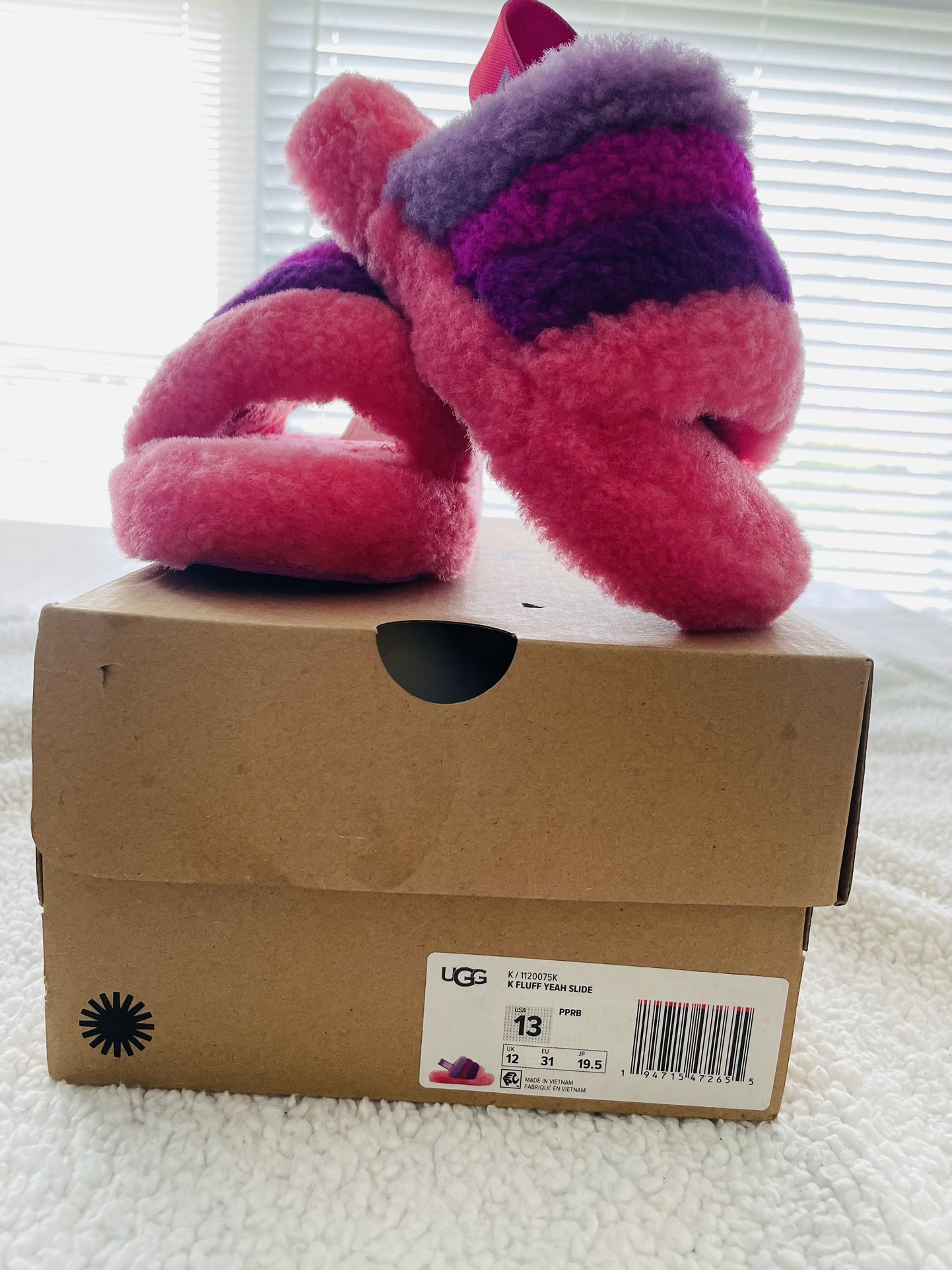 Adorable girls UGG Fluff Yeah Slide, Purple and Pink, size 13, super cute and comfy, slides have been thoroughly cleaned and disinfected, very good condition, have original box