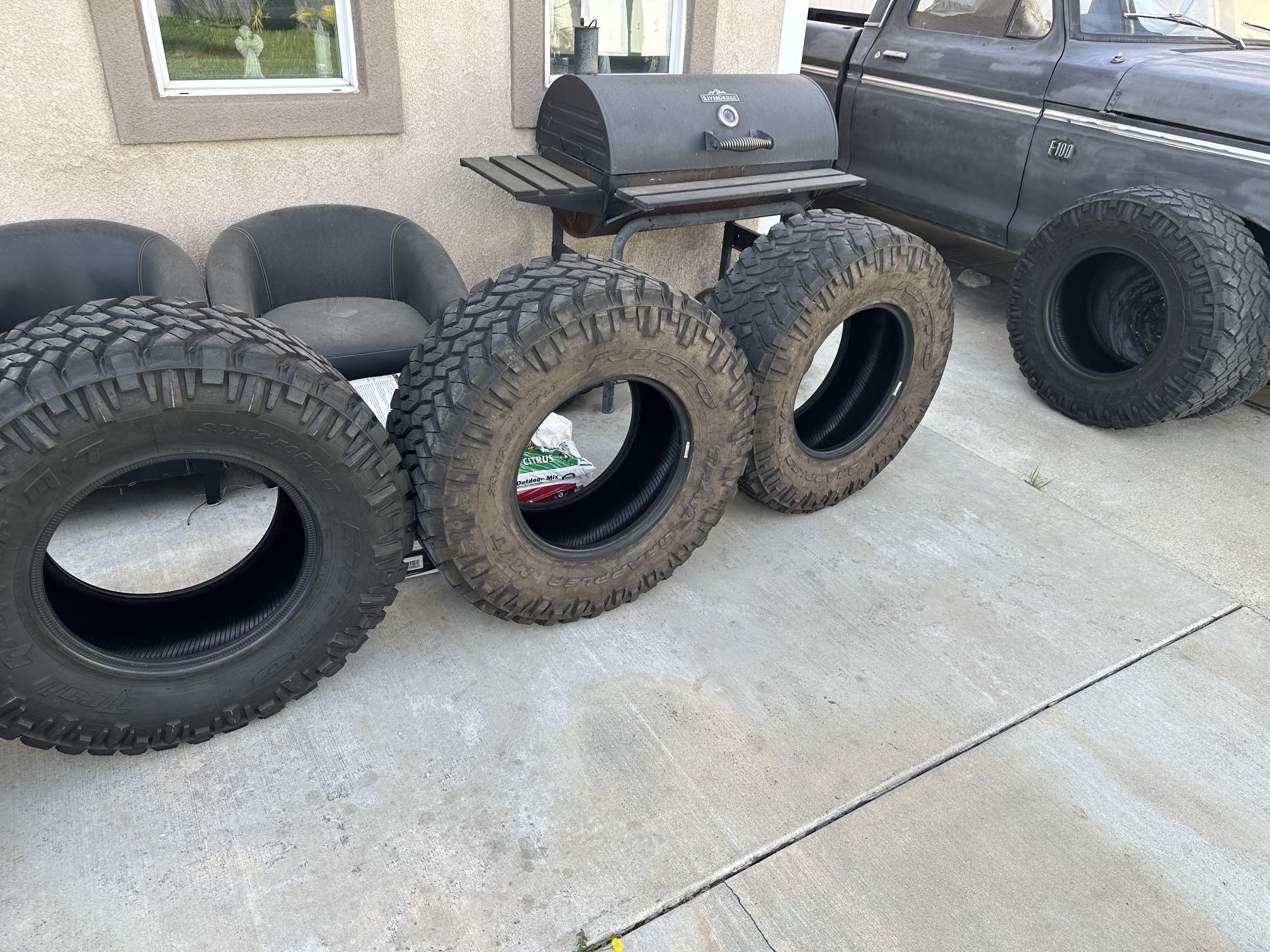 Used tires 2 have about 70% tread and the other 2 have about 50% tread $500 obo for all 4, no issues, no leaks I went with new A/T tires. 35x12.50r 17