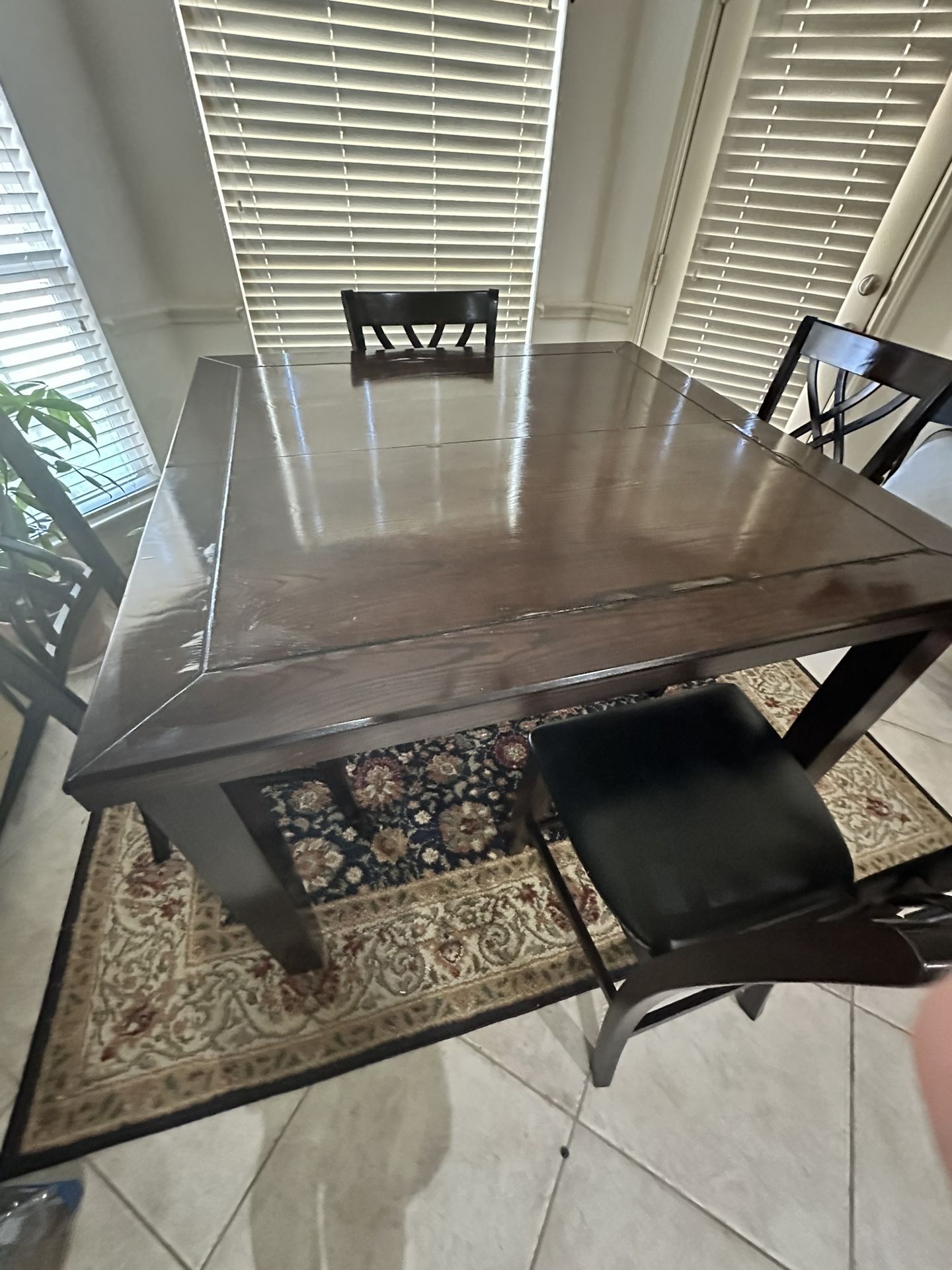 Counter Height Square wooden dining/Kitchen table Dark Brown 54” L 54” W 4 padded Chairs and bench Good condition!